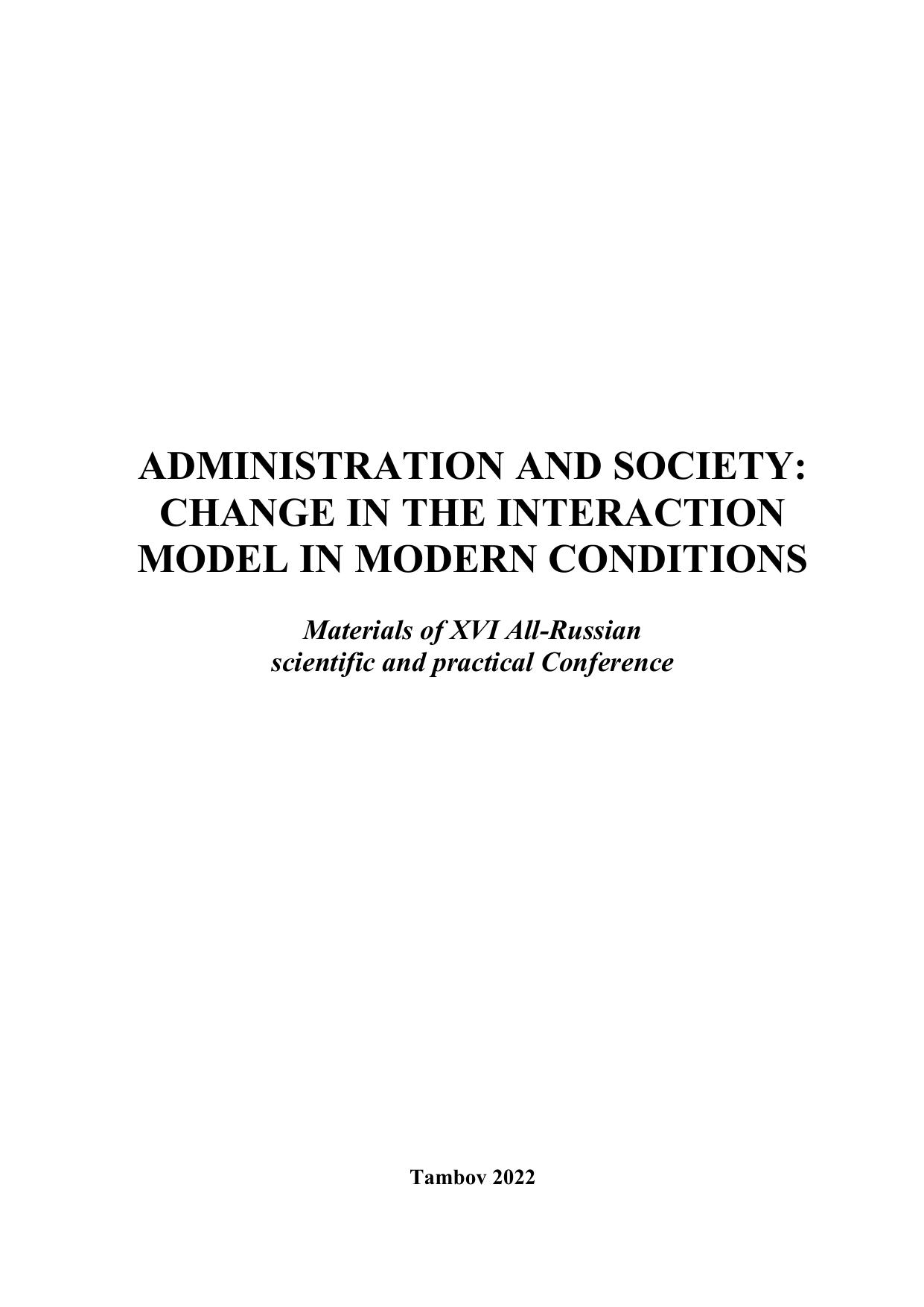 Сборник подготовлен по материалам участников ХVI Всероссийской научнопрактической конференции «Управление и общество: изменение моделивзаимодействия в современных условиях», организованной Тамбовским филиалом РАНХиГС совместно с Администрацией Тамбовской области. Конференция была посвящена актуальным проблемам изменения системы взаимодействий общества и власти на современном этапе развития, изменения механизмов реагирования на новые вызовы. Участниками конференции представлены исследовательские материалы по заявленной проблематике.