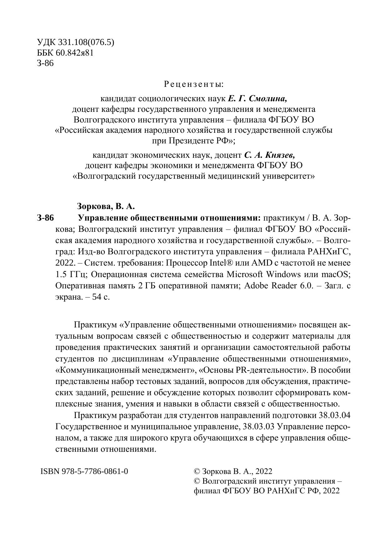 Практикум «Управление общественными отношениями» посвящен ак-туальным вопросам связей с общественностью и содержит материалы для проведения практических занятий и организации самостоятельной работы студентов по дисциплинам «Управление общественными отношениями», «Коммуникационный менеджмент», «Основы PR-деятельности». В пособии представлены набор тестовых заданий, вопросов для обсуждения, практиче-ских заданий, решение и обсуждение которых позволит сформировать ком-плексные знания, умения и навыки в области связей с общественностью. Практикум разработан для студентов направлений подготовки 38.03.04 Государственное и муниципальное управление, 38.03.03 Управление персо-налом, а также для широкого круга обучающихся в сфере управления обще-ственными отношениями.
