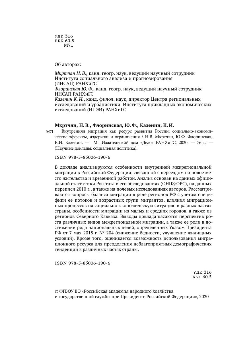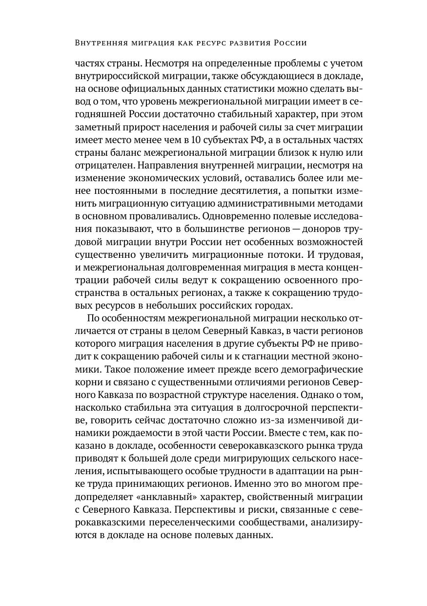 В докладе анализируются особенности внутренней межрегиональной миграции в Российской Федерации, связанной с переездом на новое место жительства и временной работой. Анализ основан на данных официальной статистики Росстата и его обследованиях (ОНПЗ/ОРС), на данных переписи 2010 г., а также на полевых исследованиях авторов. Рассматриваются вопросы баланса миграции в ряде регионов РФ с учетом специфики ее потоков и возрастных групп мигрантов, влияния миграционных процессов на социально-экономическую ситуацию в разных частях страны, особенности миграции из малых и средних городов, а также из регионов Северного Кавказа. Выводы доклада касаются перспектив роста различных видов межрегиональной миграции, а также ее роли в достижении ряда национальных целей, определенных Указом Президента РФ от 7 мая 2018 г. № 204 (снижение бедности, улучшение жилищных условий). Кроме того, оценивается возможность использования миграционного ресурса для преодоления неблагоприятных демографических тенденций в различных частях страны.