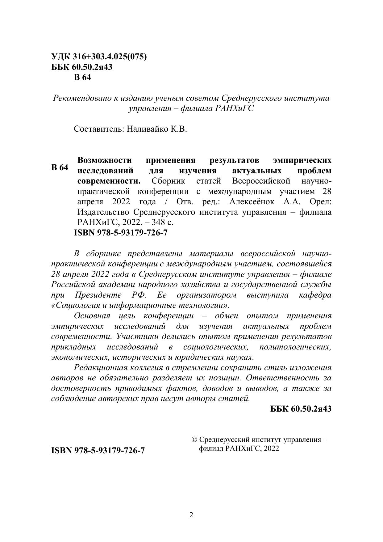 В сборнике представлены материалы всероссийской научнопрактической конференции с международным участием, состоявшейся 28 апреля 2022 года в Среднерусском институте управления – филиале Российской академии народного хозяйства и государственной службы при Президенте РФ. Ее организатором выступила кафедра «Социология и информационные технологии». Основная цель конференции – обмен опытом применения эмпирических исследований для изучения актуальных проблем современности. Участники делились опытом применения результатов прикладных исследований в социологических, политологических, экономических, исторических и юридических науках. Редакционная коллегия в стремлении сохранить стиль изложения авторов не обязательно разделяет их позиции. Ответственность за достоверность приводимых фактов, доводов и выводов, а также за соблюдение авторских прав несут авторы статей.