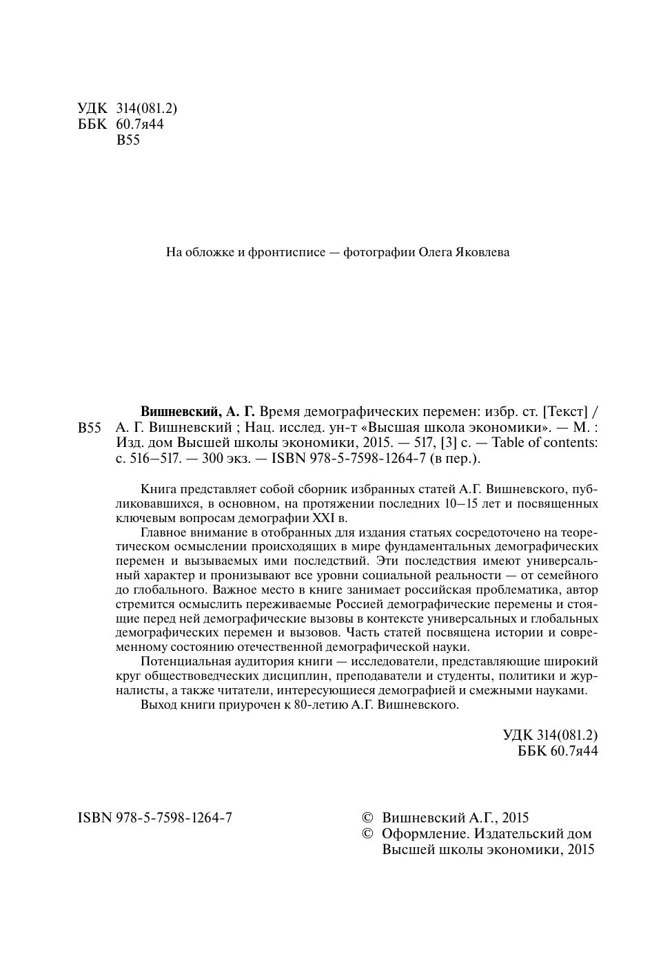 Книга представляет собой сборник избранных статей А.Г. Вишневского, публиковавшихся, в основном, на протяжении последних 10–15 лет и посвященных ключевым вопросам демографии XXI в. Главное внимание в отобранных для издания статьях сосредоточено на теоретическом осмыслении происходящих в мире фундаментальных демографических перемен и вызываемых ими последствий. Эти последствия имеют универсальный характер и пронизывают все уровни социальной реальности — от семейного до глобального. Важное место в книге занимает российская проблематика, автор стремится осмыслить переживаемые Россией демографические перемены и стоящие перед ней демографические вызовы в контексте универсальных и глобальных демографических перемен и вызовов. Часть статей посвящена истории и современному состоянию отечественной демографической науки. Потенциальная аудитория книги — исследователи, представляющие широкий круг обществоведческих дисциплин, преподаватели и студенты, политики и журналисты, а также читатели, интересующиеся демографией и смежными науками. Выход книги приурочен к 80-летию А.Г. Вишневского.