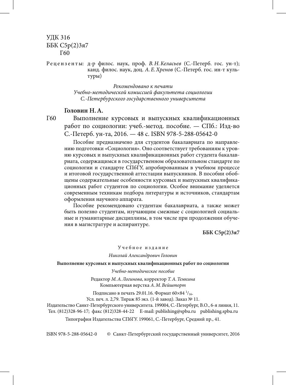 Пособие предназначено для студентов бакалавриата по направлению подготовки «Социология». Оно соответствует требованиям к уровню курсовых и выпускных квалификационных работ студента бакалавриата, содержащимся в государственном образовательном стандарте по социологии и стандарте СПбГУ, апробированным в учебном процессе и итоговой государственной аттестации выпускников. В пособии обобщены содержательные особенности курсовых и выпускных квалификационных работ студентов по социологии. Особое внимание уделяется современным техникам подбора литературы и источников, стандартам оформления научного аппарата. Пособие рекомендовано студентам бакалавриата, а также может быть полезно студентам, изучающим смежные с социологией социальные и гуманитарные дисциплины, в том числе при продолжении обучения в магистратуре и аспирантуре.