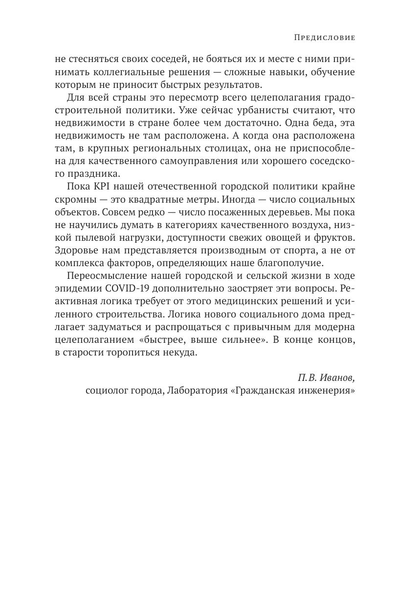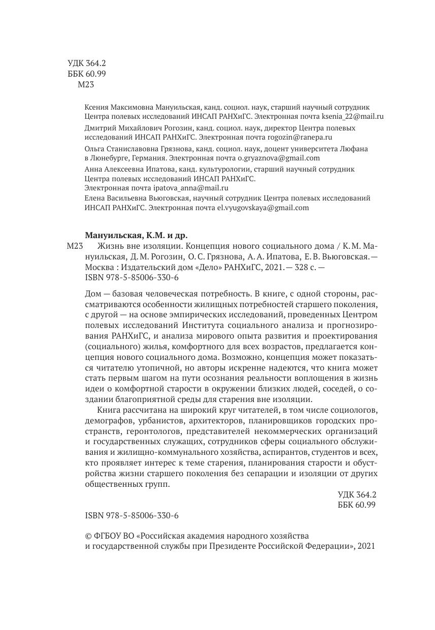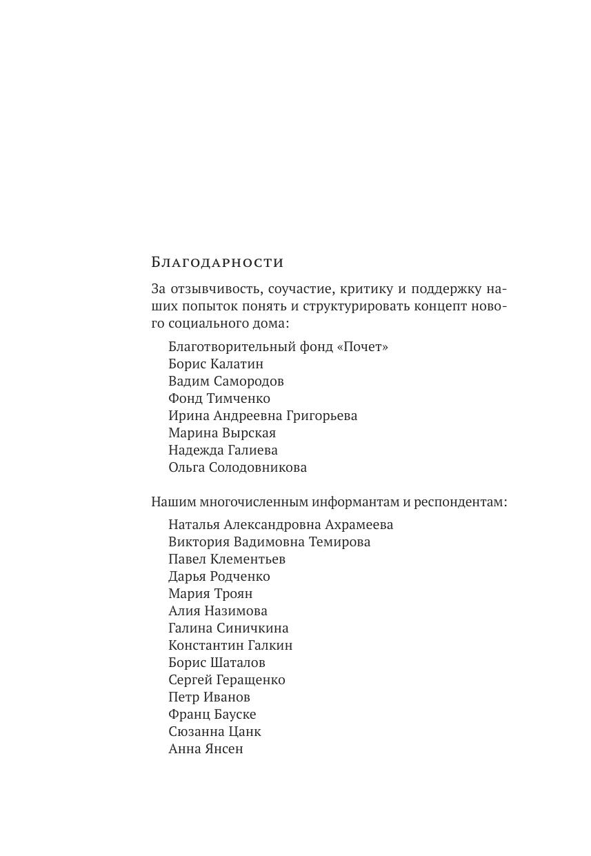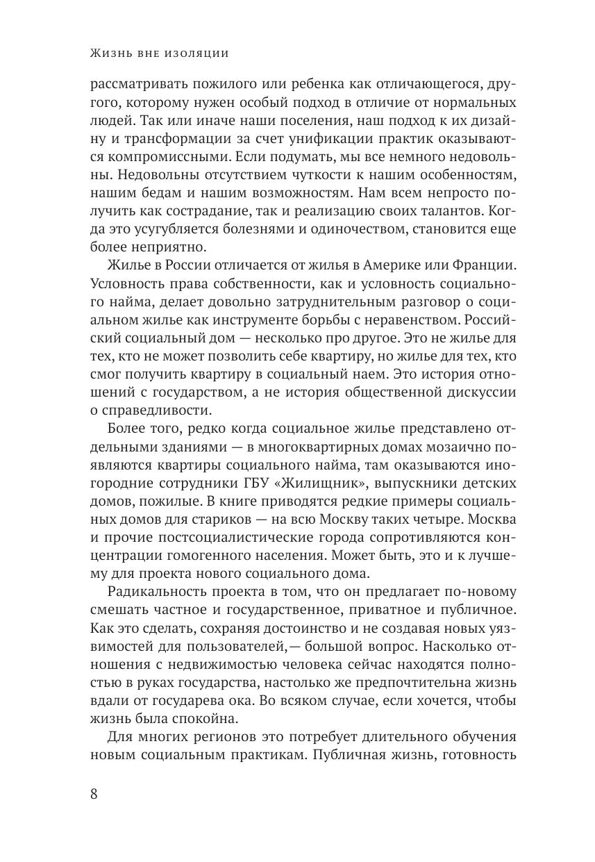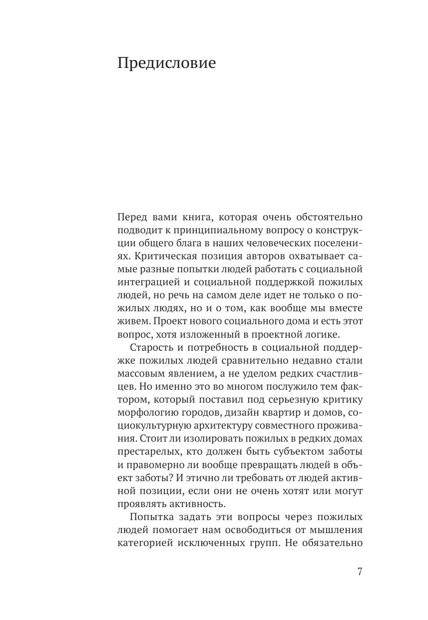 Дом — базовая человеческая потребность. В книге, с одной стороны, рас-сматриваются особенности жилищных потребностей старшего поколения, с другой — на основе эмпирических исследований, проведенных Центром полевых исследований Института социального анализа и прогнозирования РАНХиГС, и анализа мирового опыта развития и проектирования (социального) жилья, комфортного для всех возрастов, предлагается концепция нового социального дома. Возможно, концепция может показаться читателю утопичной, но авторы искренне надеются, что книга может стать первым шагом на пути осознания реальности воплощения в жизнь идеи о комфортной старости в окружении близких людей, соседей, о создании благоприятной среды для старения вне изоляции.