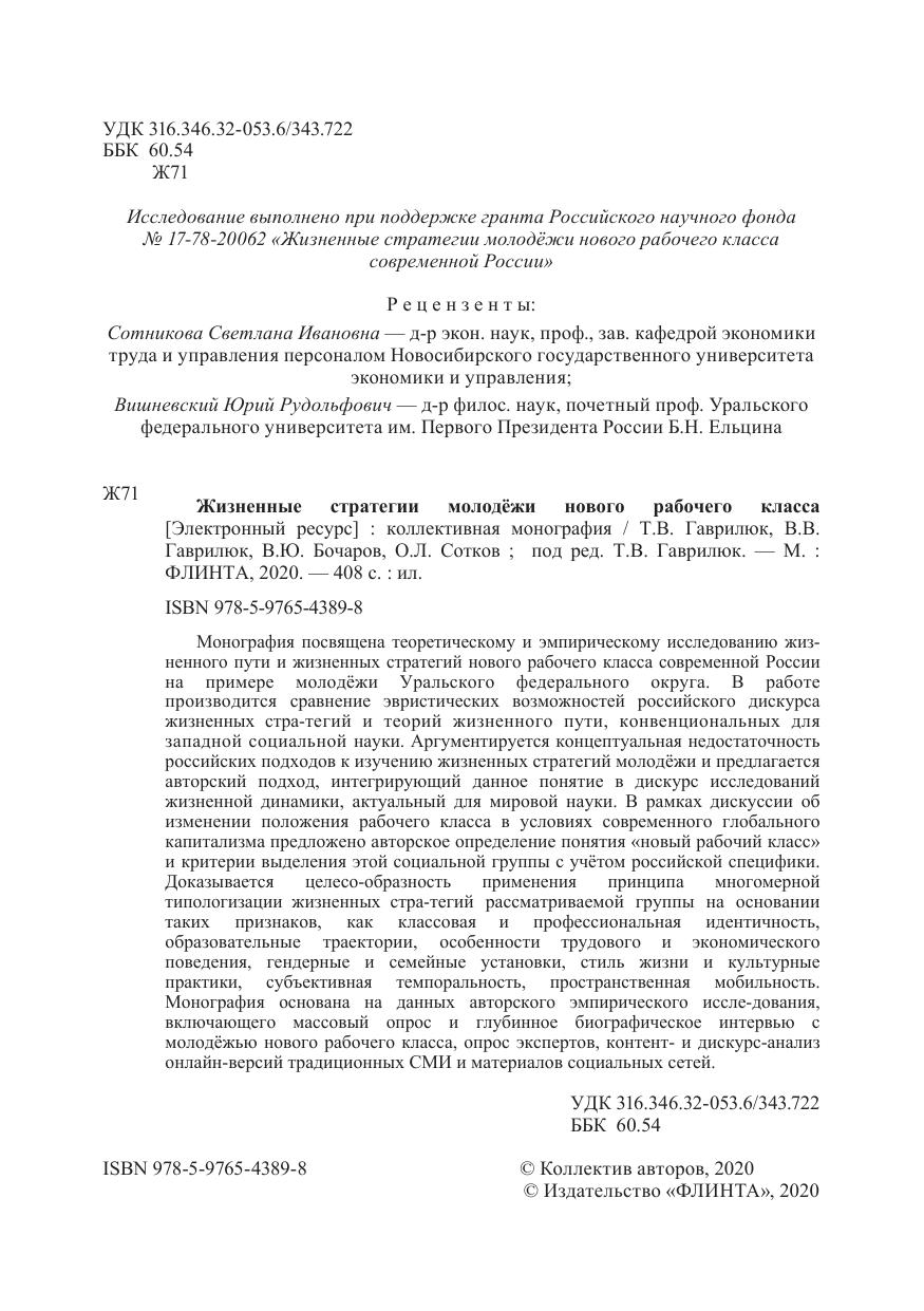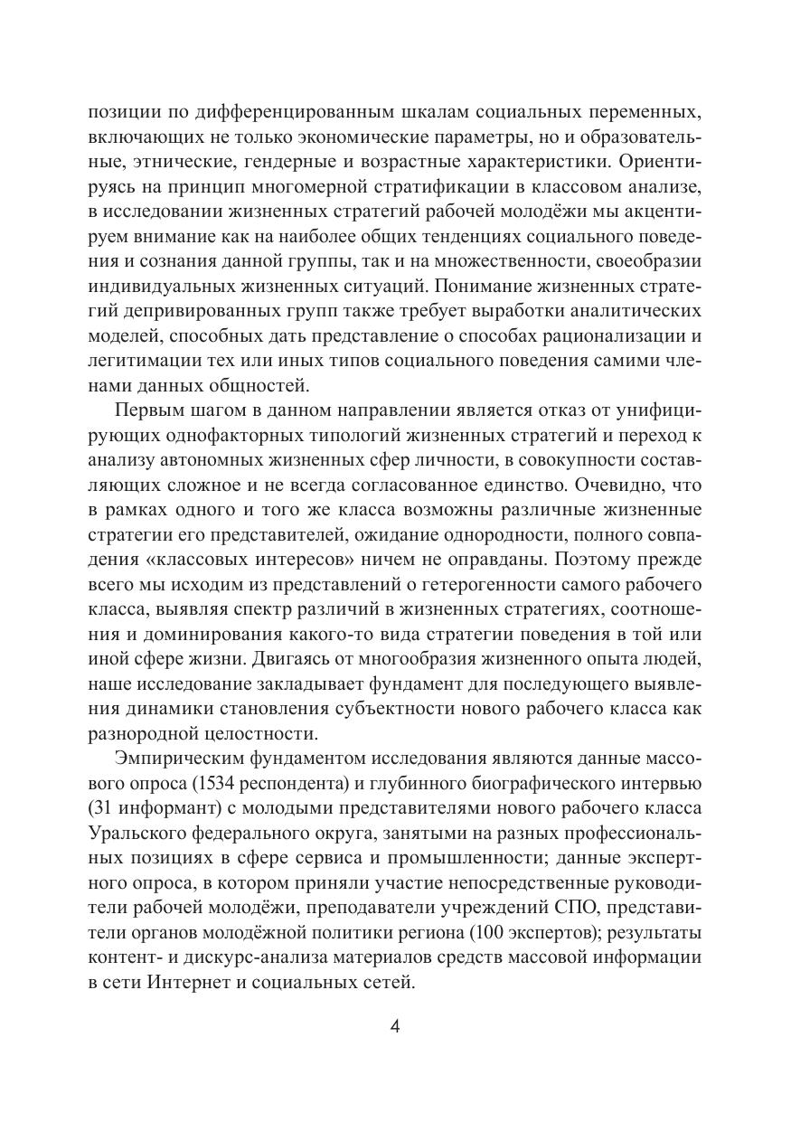 Монография посвящена теоретическому и эмпирическому исследованию жизненного пути и жизненных стратегий нового рабочего класса современной России на примере молодёжи Уральского федерального округа. В работе производится сравнение эвристических возможностей российского дискурса жизненных стратегий и теорий жизненного пути, конвенциональных для западной социальной науки. Аргументируется концептуальная недостаточность российских подходов к изучению жизненных стратегий молодёжи и предлагается авторский подход, интегрирующий данное понятие в дискурс исследований жизненной динамики, актуальный для мировой науки. В рамках дискуссии об изменении положения рабочего класса в условиях современного глобального капитализма предложено авторское определение понятия «новый рабочий класс» и критерии выделения этой социальной группы с учётом российской специфики. Доказывается целесообразность применения принципа многомерной типологизации жизненных стратегий рассматриваемой группы на основании таких признаков, как классовая и профессиональная идентичность, образовательные траектории, особенности трудового и экономического поведения, гендерные и семейные установки, стиль жизни и культурные практики, субъективная темпоральность, пространственная мобильность. Монография основана на данных авторского эмпирического исследования, включающего массовый опрос и глубинное биографическое интервью с молодёжью нового рабочего класса, опрос экспертов, контент- и дискурс-анализ онлайн-версий традиционных СМИ и материалов социальных сетей.