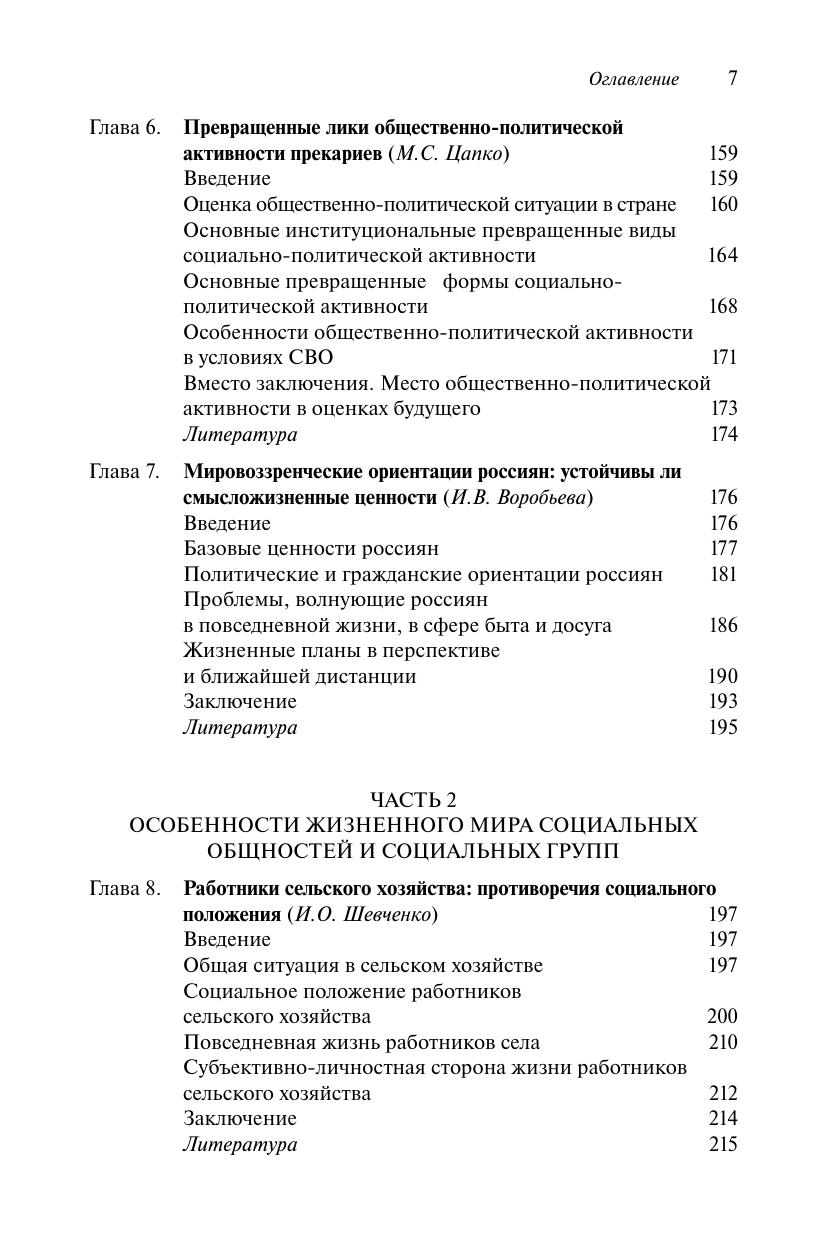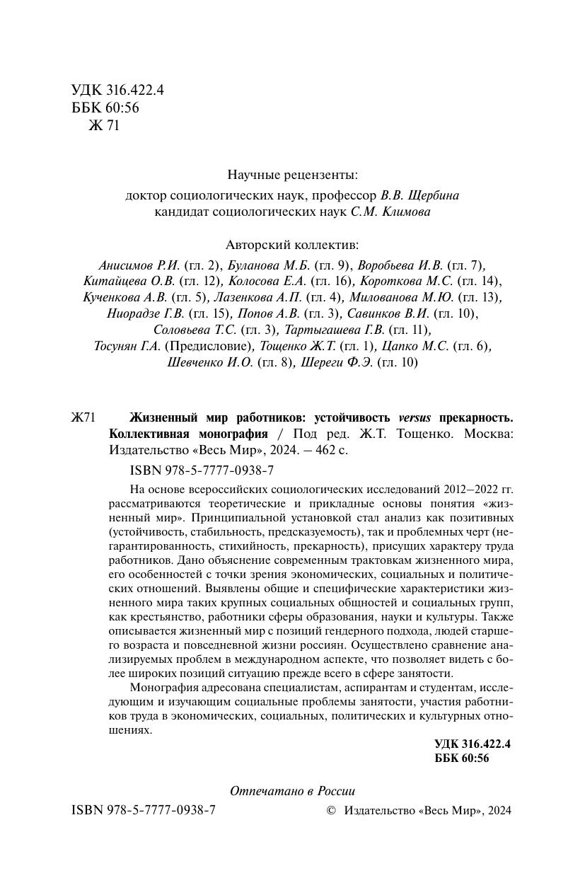 На основе всероссийских социологических исследований 2012–2022 гг. рассматриваются теоретические и прикладные основы понятия «жизненный мир». Принципиальной установкой стал анализ как позитивных (устойчивость, стабильность, предсказуемость), так и проблемных черт (негарантированность, стихийность, прекарность), присущих характеру труда работников. Дано объяснение современным трактовкам жизненного мира, его особенностей с точки зрения экономических, социальных и политических отношений. Выявлены общие и специфические характеристики жизненного мира таких крупных социальных общностей и социальных групп, как крестьянство, работники сферы образования, науки и культуры. Также описывается жизненный мир с позиций гендерного подхода, людей старшего возраста и повседневной жизни россиян. Осуществлено сравнение анализируемых проблем в международном аспекте, что позволяет видеть с более широких позиций ситуацию прежде всего в сфере занятости. Монография адресована специалистам, аспирантам и студентам, исследующим и изучающим социальные проблемы занятости, участия работников труда в экономических, социальных, политических и культурных отношениях.