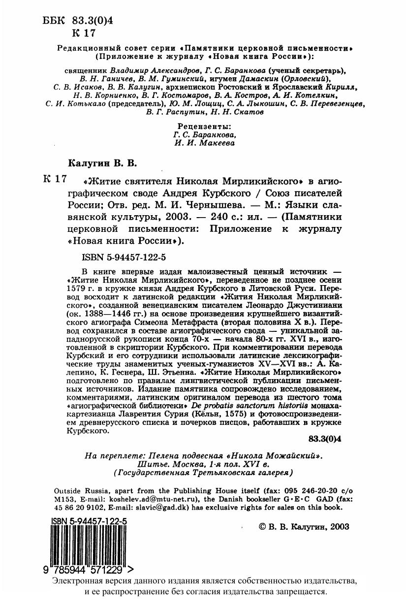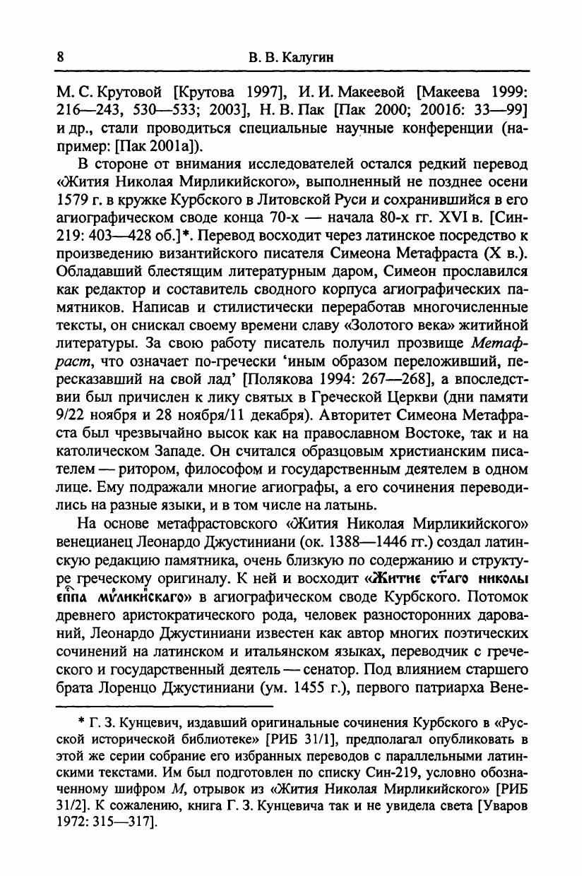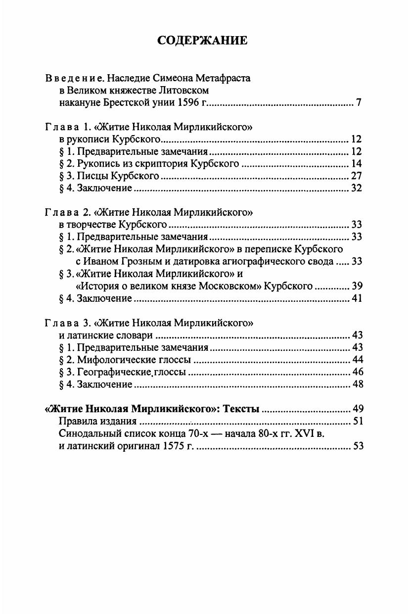 В книге впервые издан малоизвестный ценный источник - «Житие Николая Мирликийского», переведенное не позднее осени 1579 г. в кружке князя Андрея Курбского в Литовской Руси. Перевод восходит к латинской редакции «Жития Николая Мирликийского», созданной венецианским писателем Леонардо Джустиниани (ок. 1388-1446 гг.) на основе произведения крупнейшего византийского агиографа Симеона Метафраста (вторая половина X в.). Перевод сохранился в составе агиографического свода - уникальной западнорусской рукописи конца 70-х - начала 80-х гг. XVI в., изготовленной в скриптории Курбского. При комментировании перевода Курбский и его сотрудники использовали латинские лексикографические труды знаменитых ученых-гуманистов XV-XVI вв.: А. Калепино, К. Геснера, Ш. Этьенна. «Житие Николая Мирликийского» подготовлено по правилам лингвистической публикации письменных источников. Издание памятника сопровождено исследованием, комментариями, латинским оригиналом перевода из шестого тома «агиографической библиотеки» De probatis sanctorum historiis монаха-картезианца Лаврентия Сурия (Кёльн, 1575) и фотовоспроизведением древнерусского списка и почерков писцов, работавших в кружке Курбского.