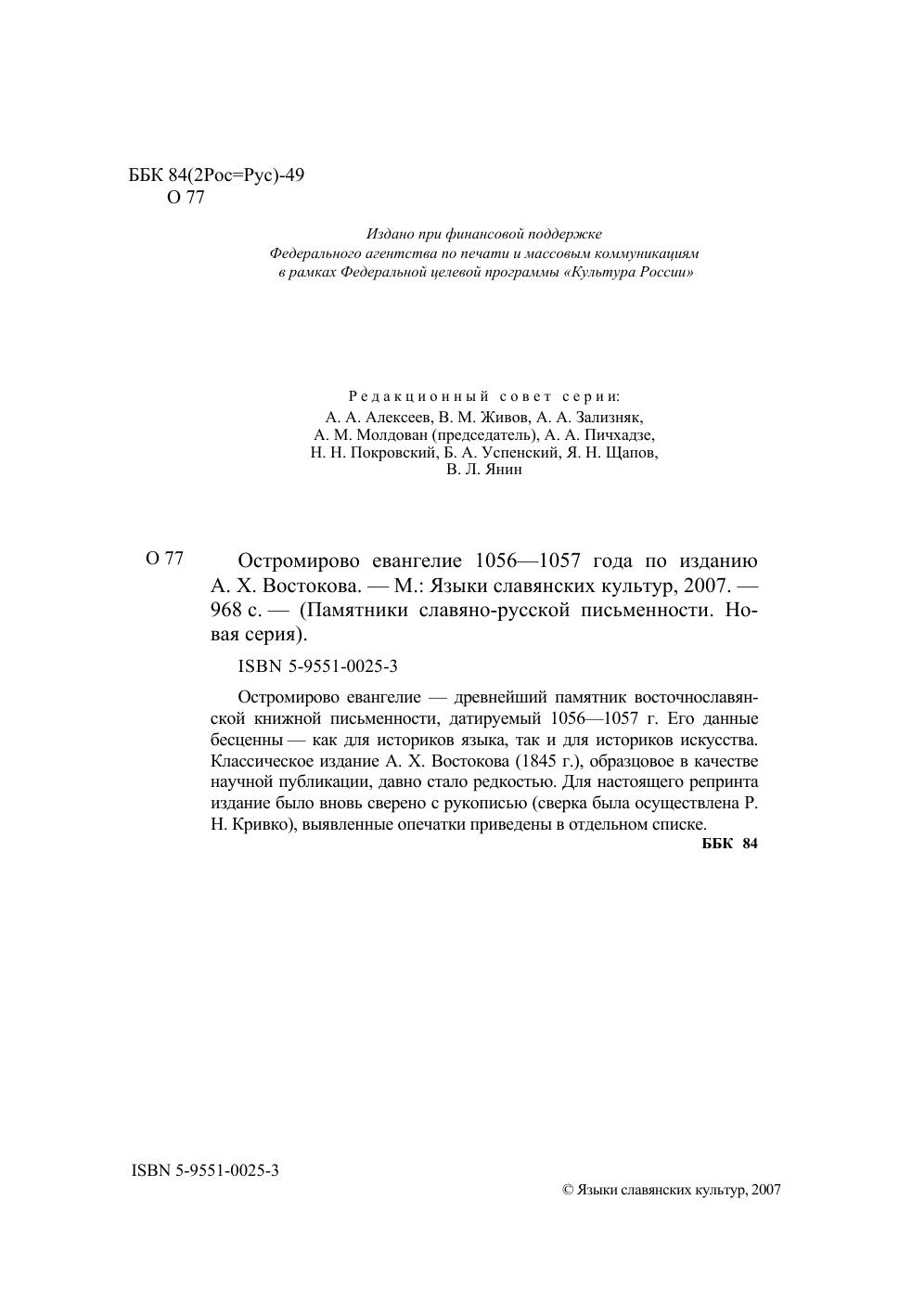 Остромирово евангелие - древнейший памятник восточнославянской книжной письменности, датируемый 1056-1057 г. Его данные бесценны как для историков языка, так и для историков искусства. Классическое издание А.X.Востокова (1845 г.), образцовое в качестве научной публикации, давно стало редкостью. Для настоящего репринта издание было вновь сверено с рукописью (сверка была осуществлена Р.Н.Кривко), выявленные опечатки приведены в отдельном списке.