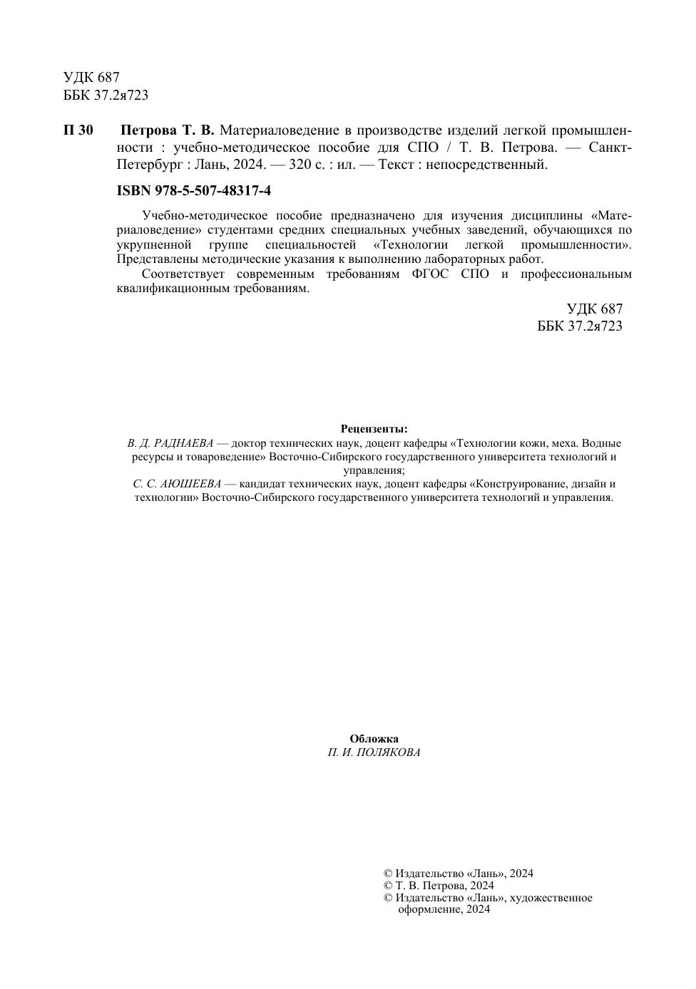 Учебно-методическое пособие предназначено для изучения дисциплины «Материаловедение» студентами средних специальных учебных заведений, обучающихся по укрупненной группе специальностей «Технологии легкой промышленности». Представлены методические указания к выполнению лабораторных работ. Соответствует современным требованиям ФГОС СПО и профессиональным квалификационным требованиям.