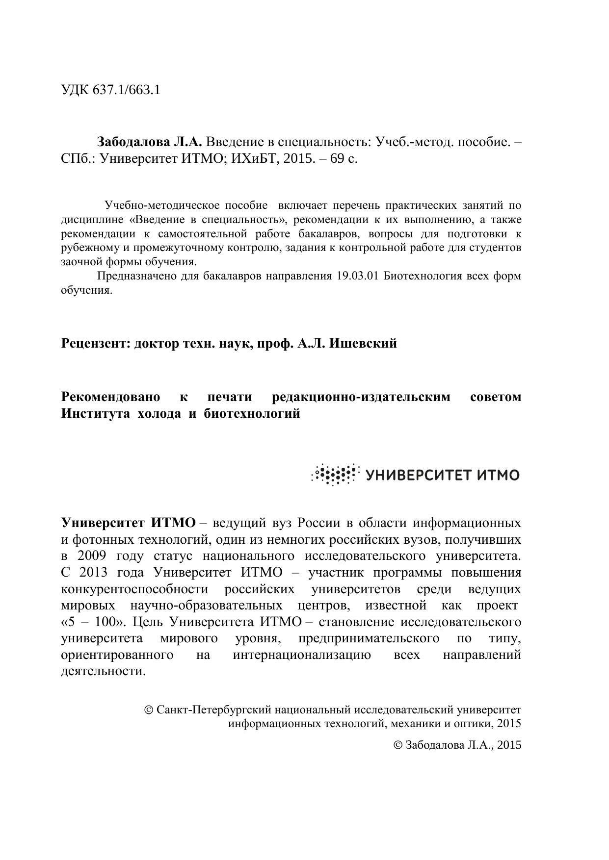 Учебно-методическое пособие включает перечень практических занятий по дисциплине «Введение в специальность», рекомендации к их выполнению, а также рекомендации к самостоятельной работе бакалавров, вопросы для подготовки к рубежному и промежуточному контролю, задания к контрольной работе для студентов заочной формы обучения. Предназначено для бакалавров направления 19.03.01 Биотехнология всех форм обучения.