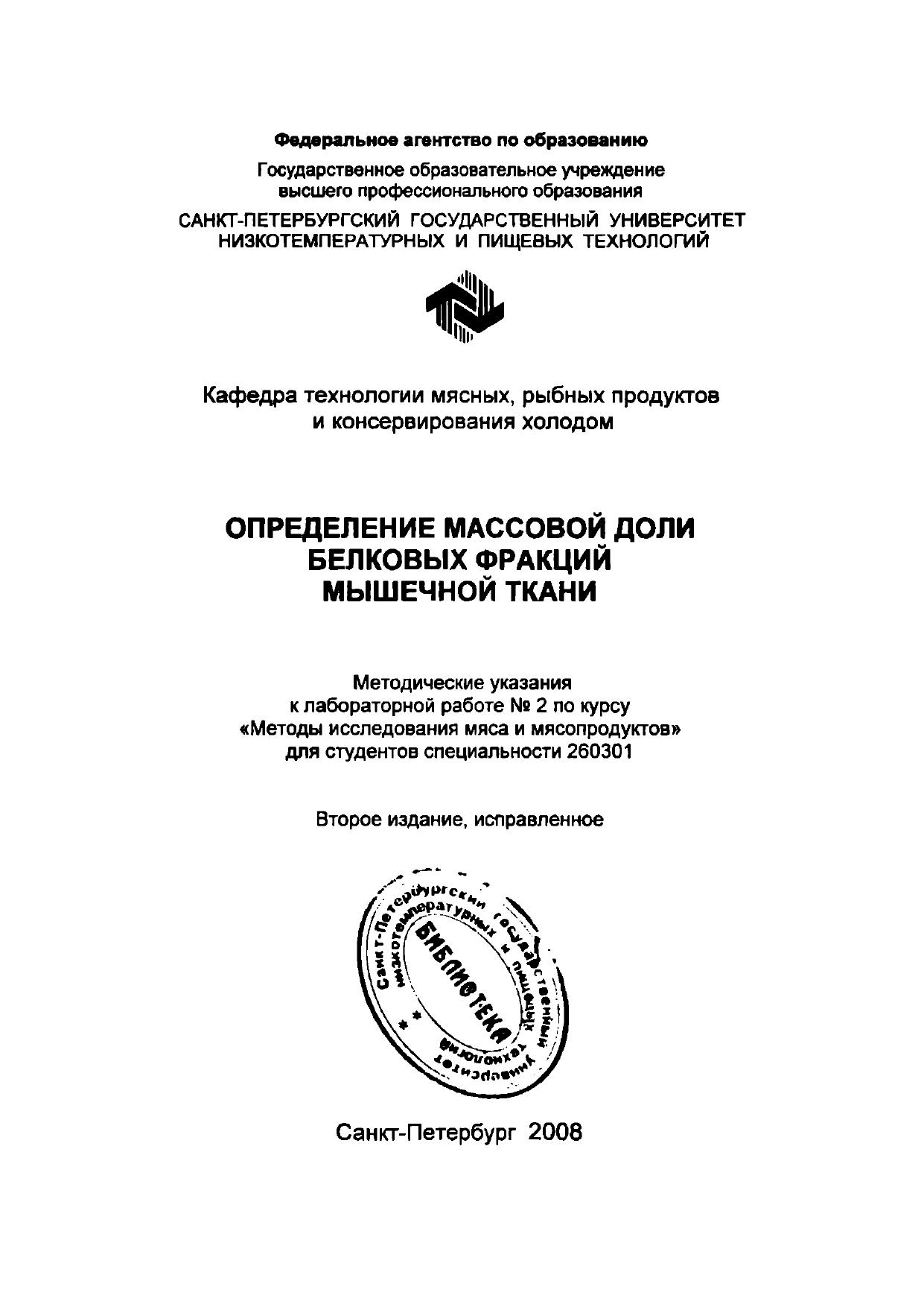 Определение массовой доли белковых фракций мышечной ткани: Методические указания к лабораторной работе № 2 по курсу «Методы исследования мяса и мясопродуктов» для студентов спец. 260301