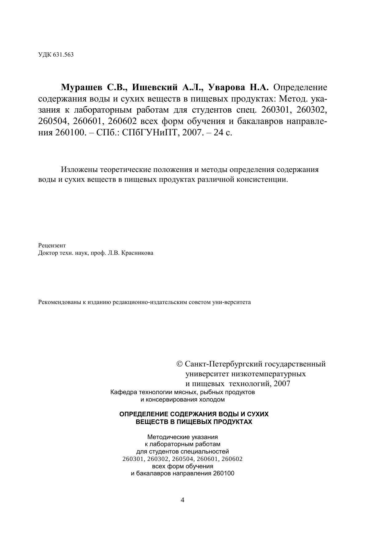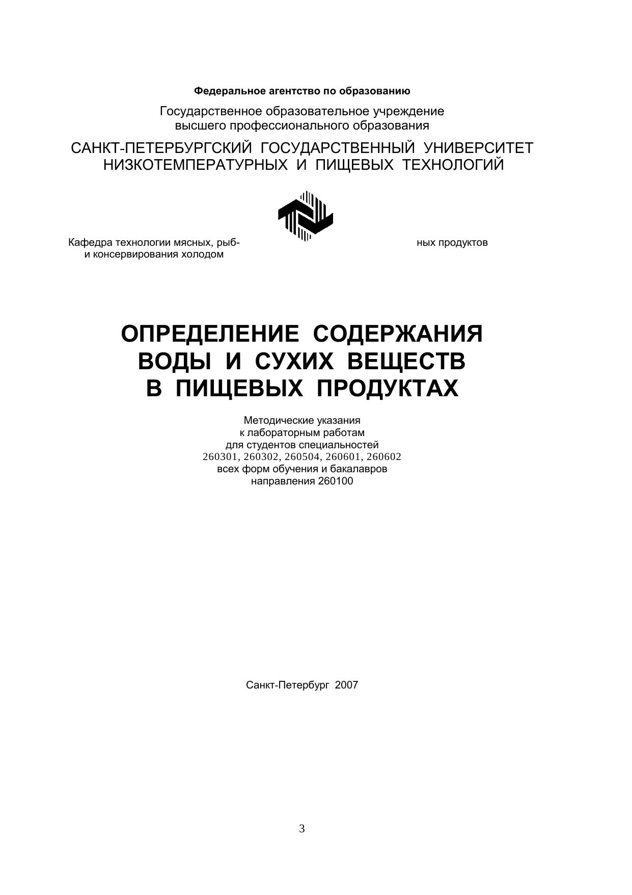 Определение содержания воды и сухих веществ в пищевых продуктах: Методические указания к лабораторным работам для студентов спец. 260301, 260302, 260504, 260601, 260602 всех форм обучения и бакалавров направления 260100