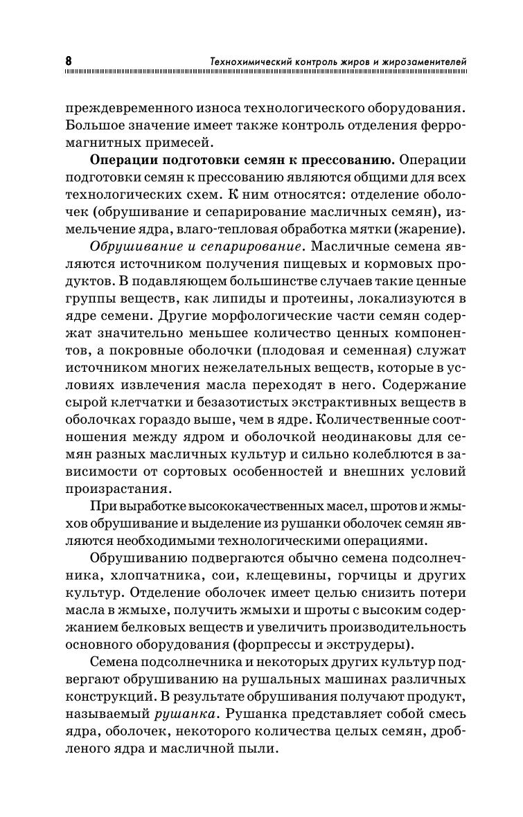 В учебном пособии рассмотрены химический состав различных жиров, их пищевая ценность, представлены методики технохимического контроля разных стадий производства растительных и животных жиров, методики определения показателей качества и технико-эксплуатационных свойств жиров, спредов и другой масложировой продукции, даны приемы проверки качества и натуральности жиров, обнаружения их фальсификации. Пособие предназначено для студентов, обучающихся по специальности «Технология жиров, эфирных масел и парфюмерно-косметических продуктов», специализация «Технология жиров». Издание также может быть полезным для инженерно-технических работников масложировой и молочной промышленности, специалистов, работающих в области товароведения и экспертизы качества и безопасности пищевой продукции.