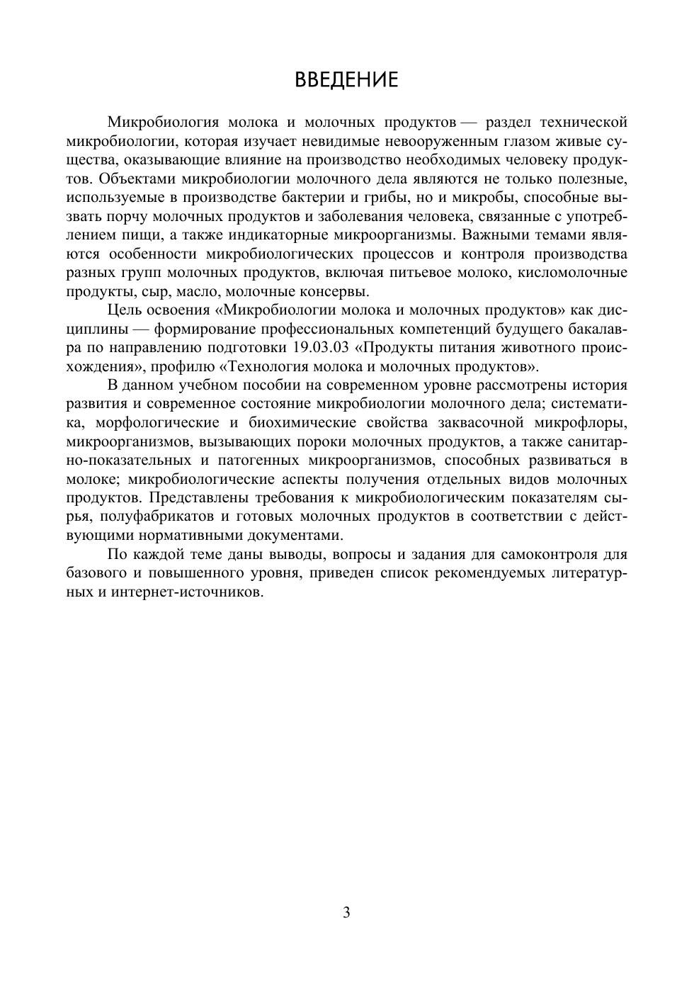 В учебном пособии рассмотрены вопросы развития микробиологии молока и молочных продуктов, современные представления о классификации и свойствах микроорганизмов, применяемых в производстве молочных продуктов, а также вызывающих их порчу и алиментарные заболевания. Дана характеристика индикаторных групп микроорганизмов, позволяющих контролировать качество и безопасность молочных продуктов. Описаны особенности микробиологических процессов и контроля производства сырого и питьевого молока, кисломолочных продуктов, сыра, масла, вторичного молочного сырья, молочных консервов и мороженого в соответствии с действующими нормативными документами. Учебное пособие предназначено для студентов вузов, аспирантов и практикующих специалистов.