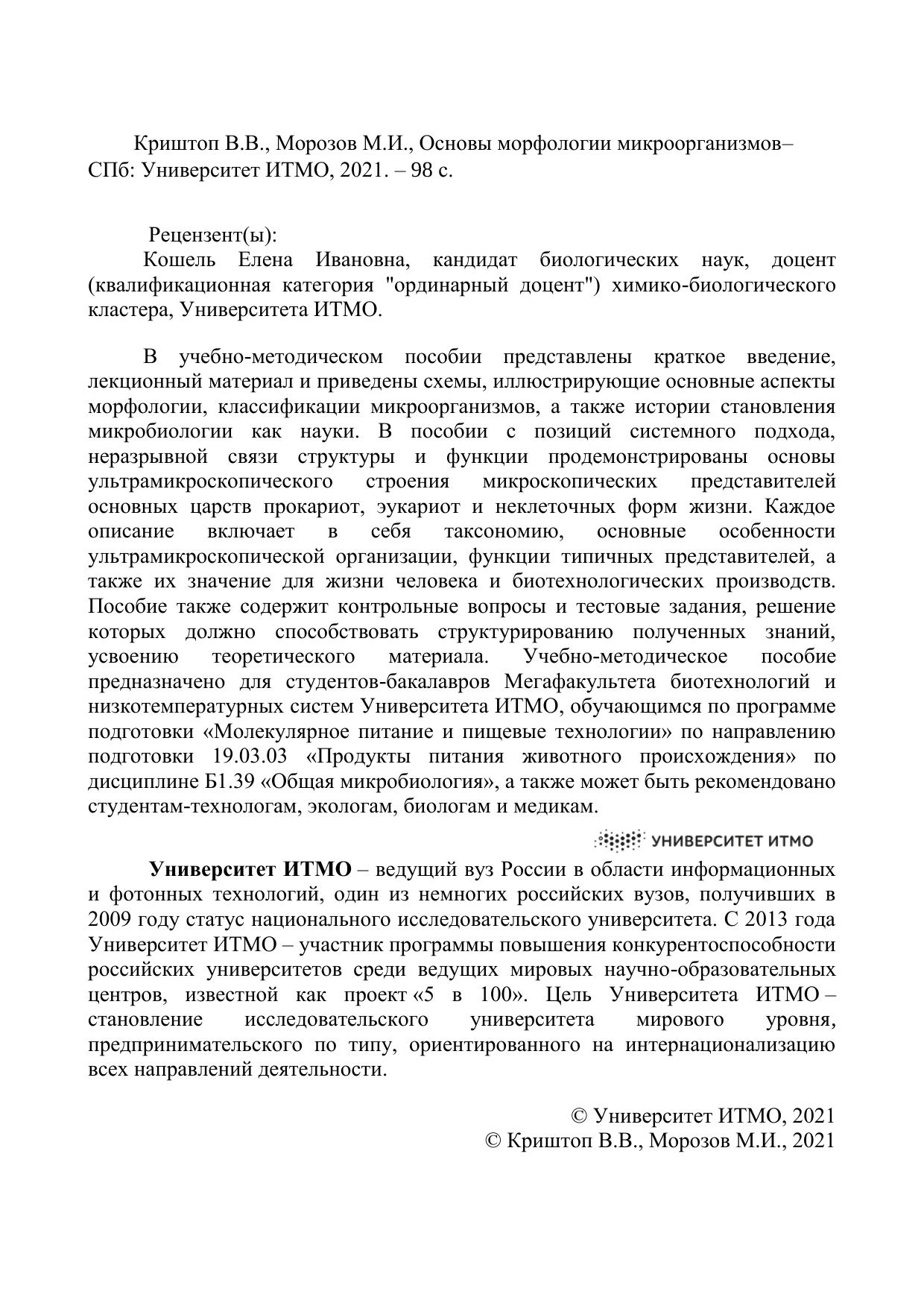 В учебно-методическом пособии представлены краткое введение, лекционный материал и приведены схемы, иллюстрирующие основные аспекты морфологии, классификации микроорганизмов, а также истории становления микробиологии как науки. В пособии с позиций системного подхода, неразрывной связи структуры и функции продемонстрированы основы ультрамикроскопического строения микроскопических представителей основных царств прокариот, эукариот и неклеточных форм жизни. Каждое описание включает в себя таксономию, основные особенности ультрамикроскопической организации, функции типичных представителей, а также их значение для жизни человека и биотехнологических производств. Пособие также содержит контрольные вопросы и тестовые задания, решение которых должно способствовать структурированию полученных знаний, усвоению теоретического материала. Учебно-методическое пособие предназначено для студентов-бакалавров Мегафакультета биотехнологий и низкотемпературных систем Университета ИТМО, обучающимся по программе подготовки «Молекулярное питание и пищевые технологии» по направлению подготовки 19.03.03 «Продукты питания животного происхождения» по дисциплине Б1.39 «Общая микробиология», а также может быть рекомендовано студентам-технологам, экологам, биологам и медикам.
