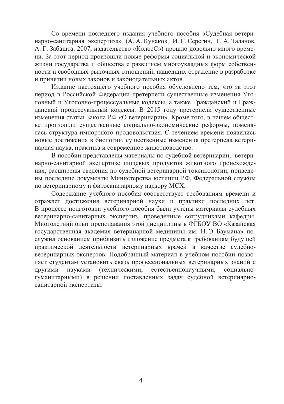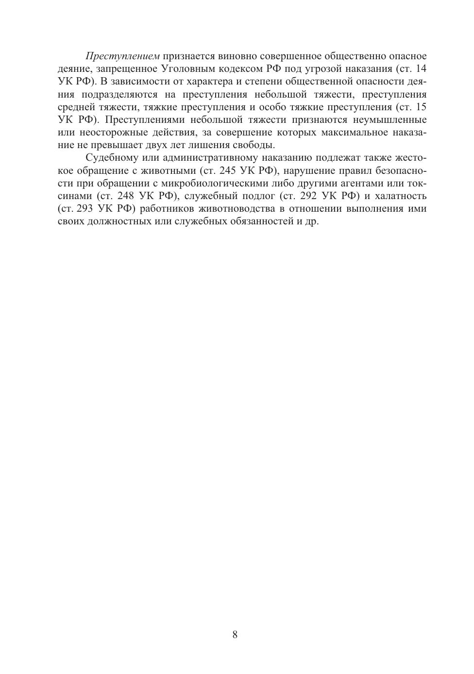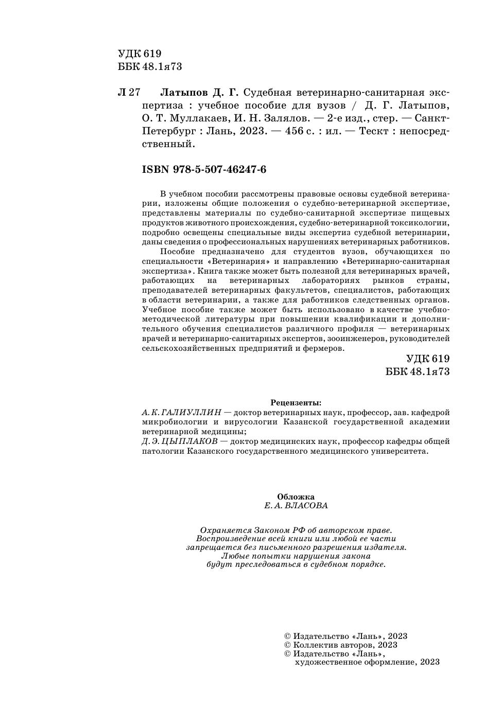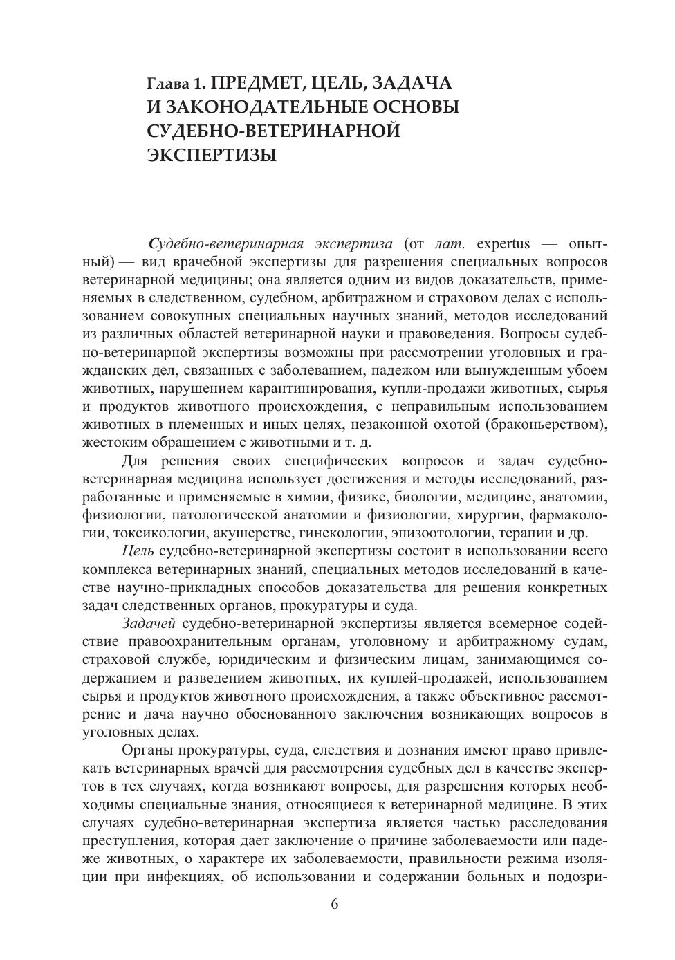 В учебном пособии рассмотрены правовые основы судебной ветеринарии, изложены общие положения о судебно-ветеринарной экспертизе, представлены материалы по судебно-санитарной экспертизе пищевых продуктов животного происхождения, судебно-ветеринарной токсикологии, подробно освещены специальные виды экспертиз судебной ветеринарии, даны сведения о профессиональных нарушениях ветеринарных работников. Пособие предназначено для студентов вузов, обучающихся по специальности «Ветеринария» и направлению «Ветеринарно-санитарная экспертиза». Книга также может быть полезной для ветеринарных врачей, работающих в ветеринарных лабораториях рынков страны, преподавателей ветеринарных факультетов, специалистов, работающих в области ветеринарии, а также для работников следственных органов. Учебное пособие также может быть использовано в качестве учебно-методической литературы при повышении квалификации и дополнительного обучения специалистов различного профиля — ветеринарных врачей и ветеринарно-санитарных экспертов, зооинженеров, руководителей сельскохозяйственных предприятий и фермеров.