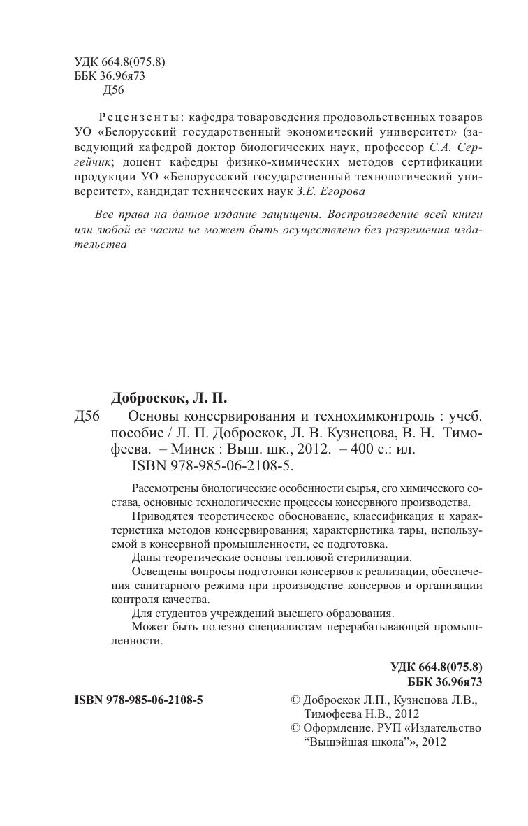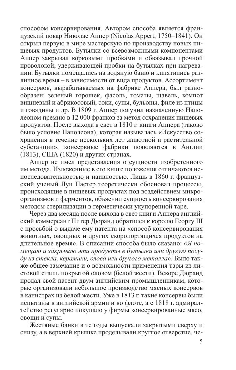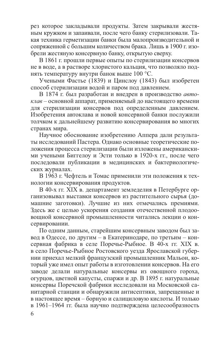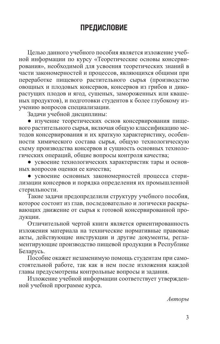 Рассмотрены биологические особенности сырья, его химического состава, основные технологические процессы консервного производства. Приводятся теоретические особенности, классификация и характеристика методов консервирования характеристика тары, используемой в консервной промышленности, ее подготовка. Даны теоретические основы тепловой стерилизации. Освещены вопросы подготовки консервов к реализации, обеспечения санитарного режима при производстве консервов и организации контроля качества. Для студентов вузов. Может быть полезно специалистам перерабатывающей промышленности.