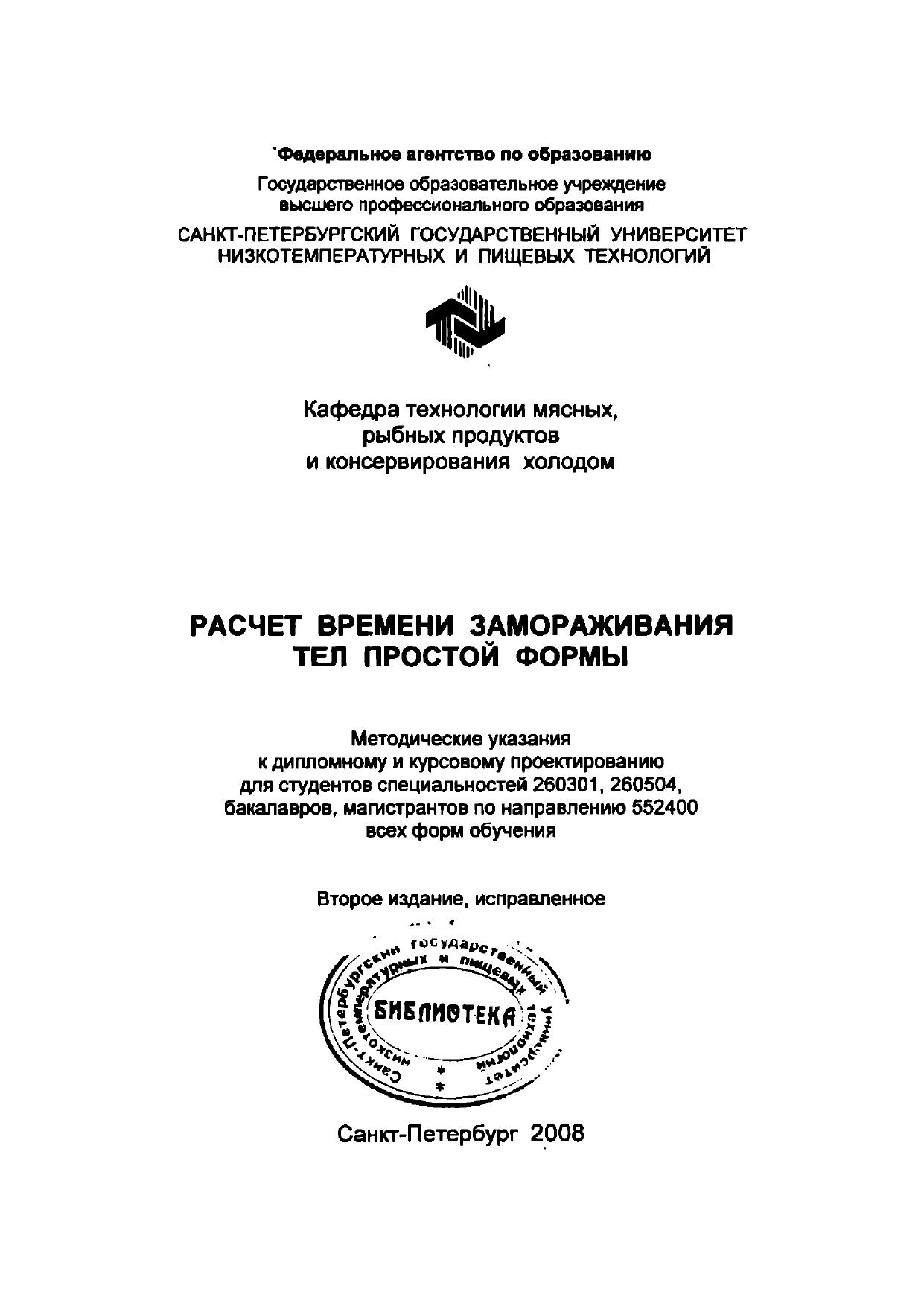 Расчёт времени замораживания тел простой формы: Методические указания к дипломному и курсовому проектированию для студентов спец. 260301, 260504, бакалавров, магистрантов по направлению 552400 всех форм обучения