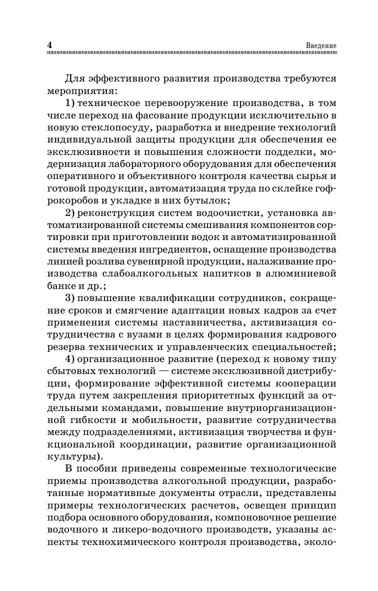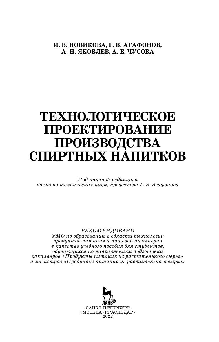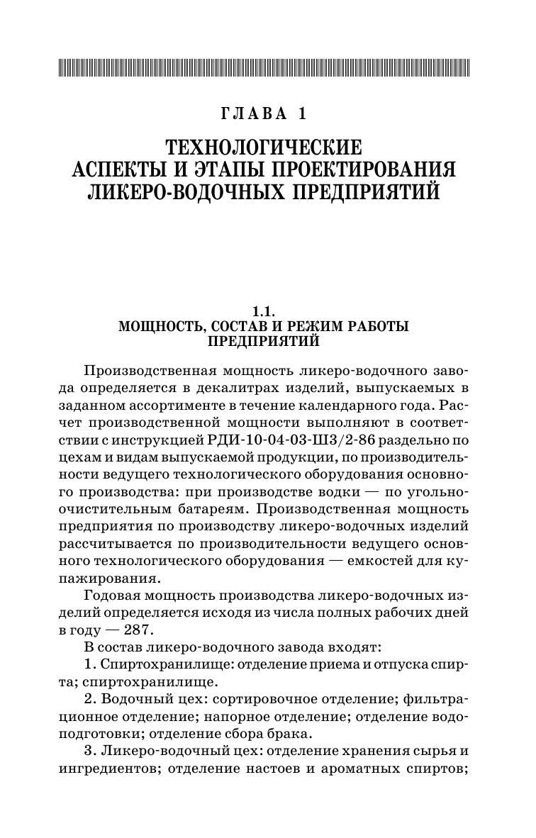 Учебное пособие составлено для выполнения выпускных квалификационных работ, а также изучения программы курса «Проектирование предприятий отрасли». В нем представлены прогрессивные аппаратурнотехнологические схемы производства спиртных напитков — водок, ликероводочных изделий, виски. Отражены современные нормативные документы отрасли, новые ГОСТ на сырье, полупродукты производства и готовую продукцию, учтены научнопрактические аспекты технологии спиртных напитков с применением древесины, актуальные разработки в технологии и оборудовании. Приведены примеры по расчету продуктов и компоновочных решений основных технологических участков производства. Даны характеристики новых видов оборудования. Приведены нормы расхода энергоресурсов, требования к метрологической службе, отоплению, вентиляции и теплоснабжению. Описаны требования к строительному проектированию, взрыво пожаробезопасности, технике безопасности и производственной санитарии, охране окружающей среды, основные техникоэкономические показатели, обобщены данные по проектированию предприятий. Предназначено для студентов, обучающихся по направлению «Продукты питания из растительного сырья».