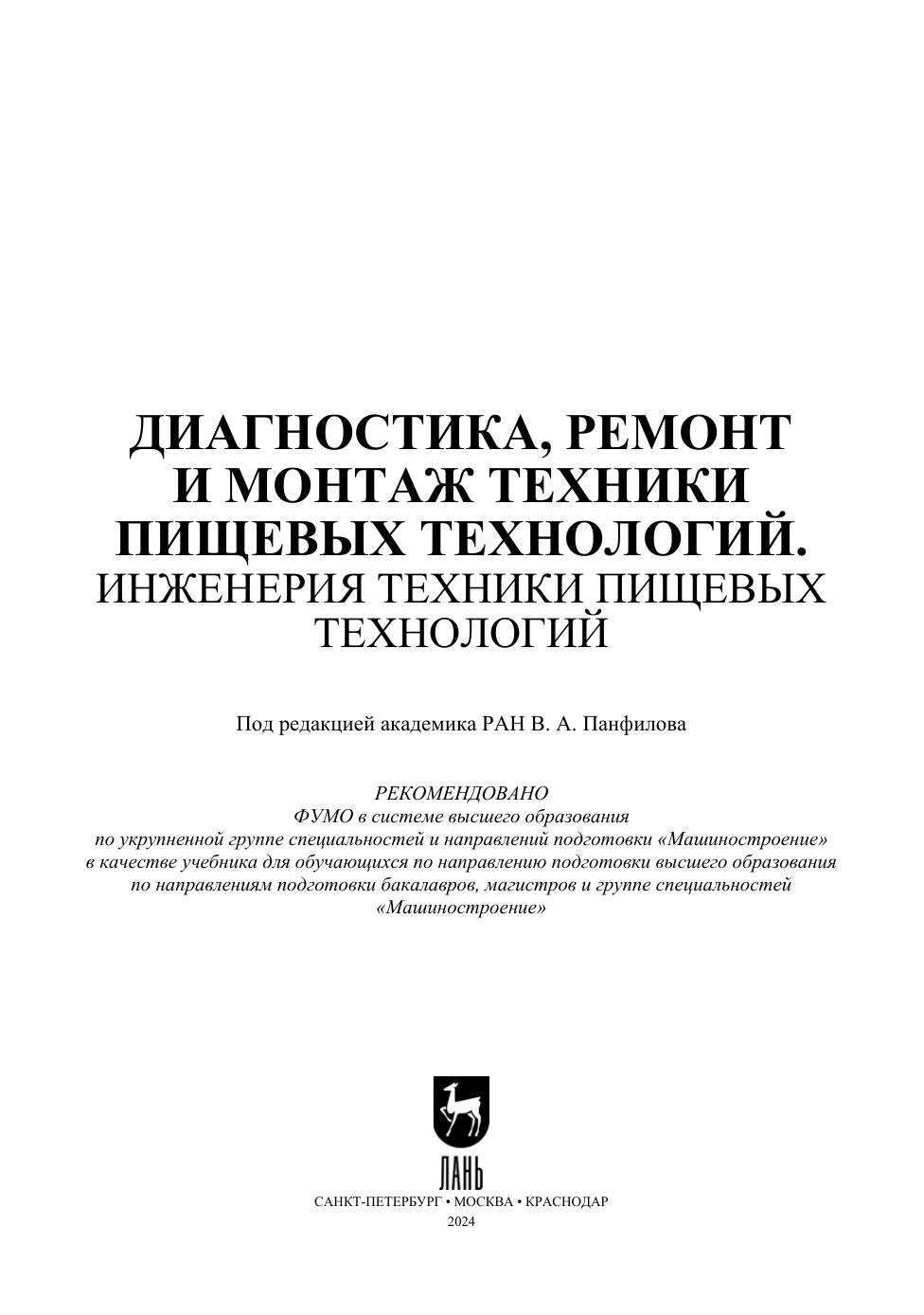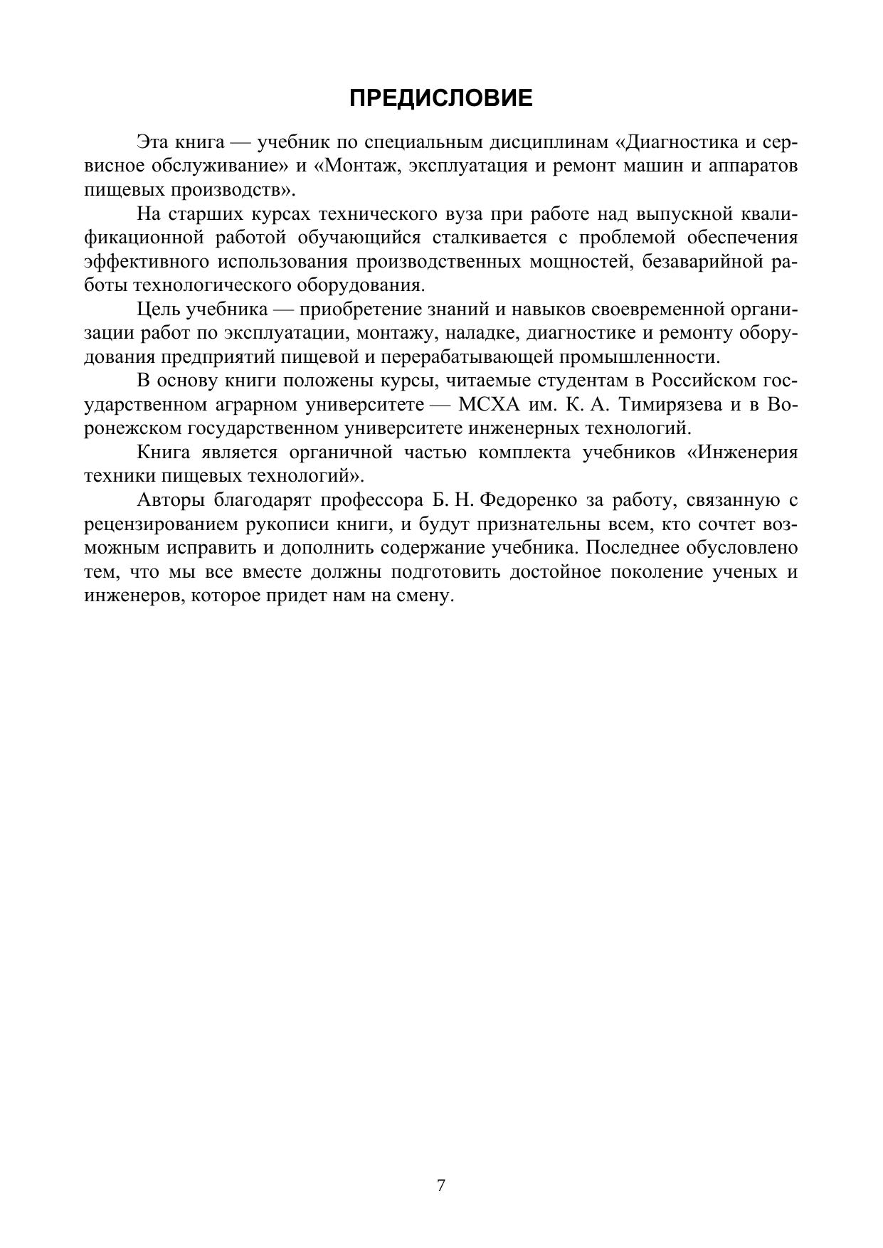 В учебнике обобщены и систематизированы основные понятия, методы и приемы монтажа, эксплуатации, диагностики и ремонта техники пищевых технологий. Учебник предназначен для аспирантов, научных работников и инженеров пищевых предприятий, а также для студентов вузов, обучающихся по направлениям подготовки «Технологические машины и оборудование», «Проектирование технологических машин и комплексов».