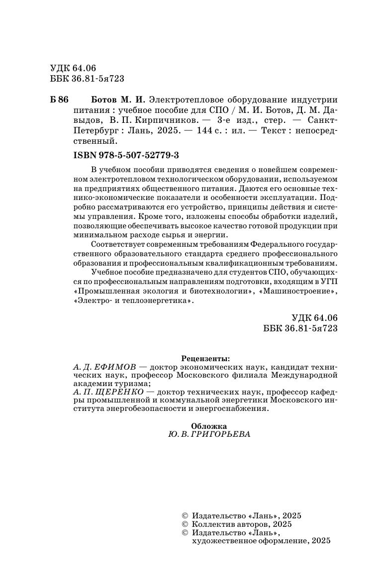 В учебном пособии приводятся сведения о новейшем современном электротепловом технологическом оборудовании, используемом в предприятиях общественного питания. Даются его основные технико-экономические показатели и особенности эксплуатации. Подробно рассматриваются его устройство, принципы действия и системы управления. Кроме того, изложены способы обработки изделий, позволяющие обеспечивать высокое качество готовой продукции при минимальном расходе сырья и энергии. Учебное пособие предназначено для студентов СПО, обучающихся по профессиональным направлениям подготовки, входящим в УГП «Промышленная экология и биотехнологии», «Машиностроение», «Электро- и теплоэнергетика». Соответствует современным требованиям Федерального государственного образовательного стандарта среднего профессионального образования и профессиональным квалификационным требованиям.