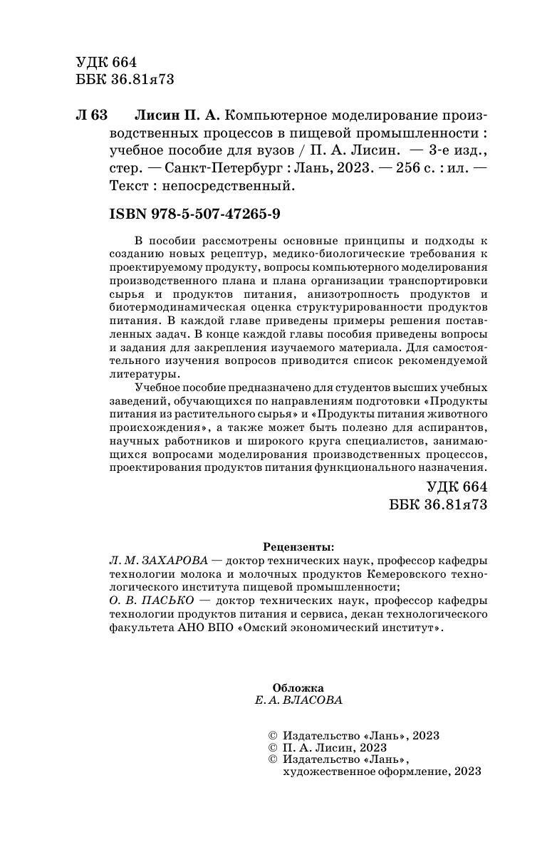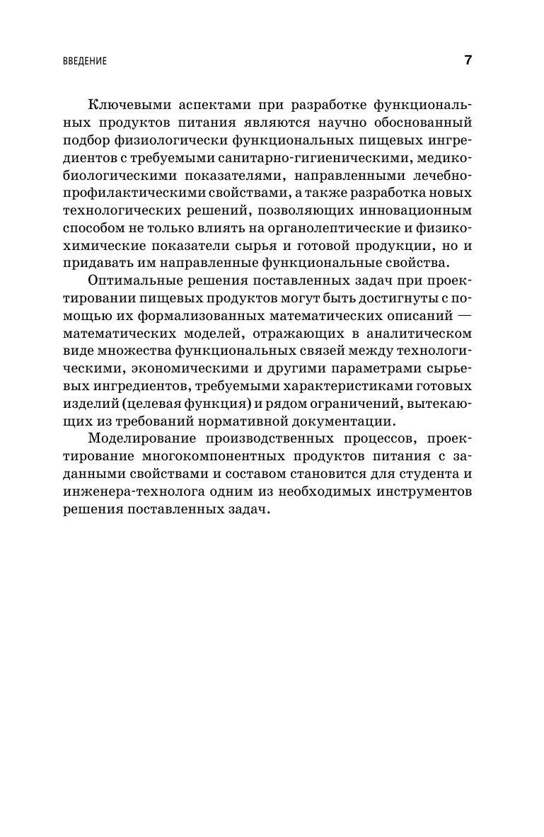 В пособии рассмотрены основные принципы и подходы к созданию новых рецептур, медико-биологические требования к проектируемому продукту, вопросы компьютерного моделирование производственного плана и плана организации транспортировки сырья и продуктов питания, анизотропность продуктов и биотемодинамическая оценка структурированности продуктов питания. В каждой главе приведены примеры решения поставленных задач. В конце каждой главы пособия приведены вопросы и задания для закрепления изучаемого материала. Для самостоятельного изучения вопросов приводится список рекомендуемой литературы. Учебное пособие предназначено для студентов высших учебных заведений, обучающихся по направлениям подготовки Продукты питания из растительного сырья» и «Продукты питания животного происхождения», а также может быть полезно для аспирантов, научных работников и широкого круга специалистов, занимающихся вопросами моделирования производственных процессов, проектирования продуктов питания функционального назначения.