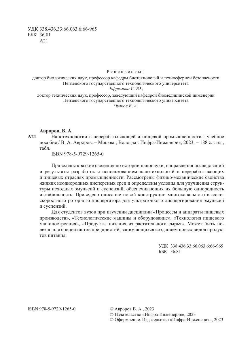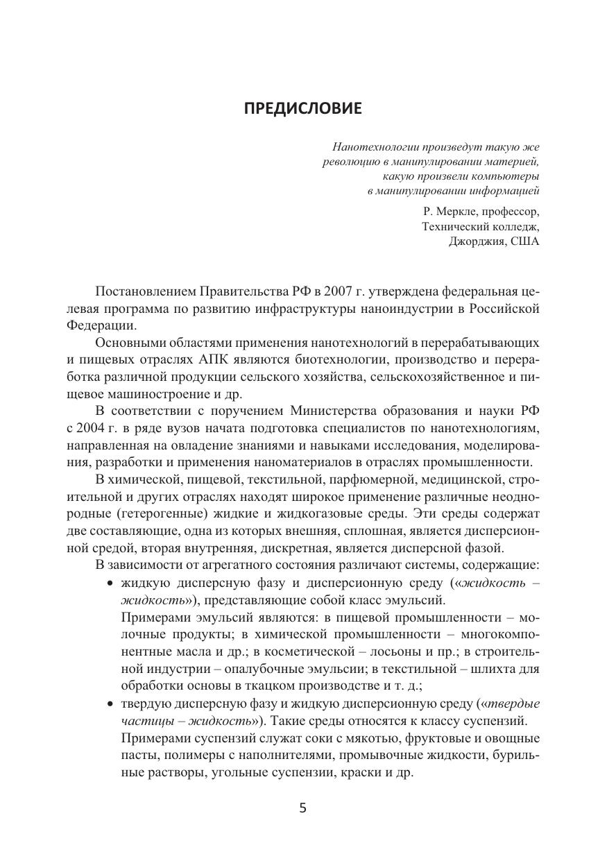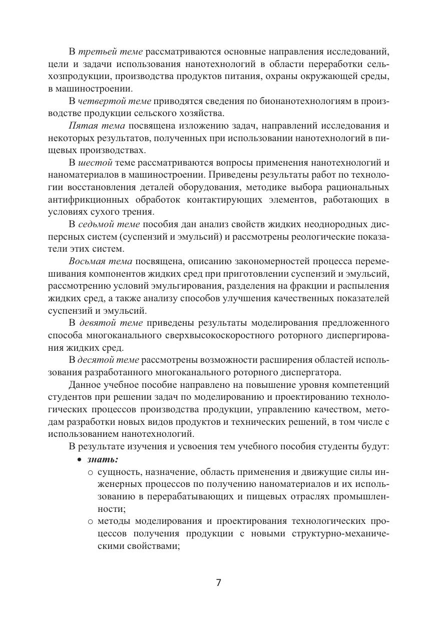 Приведены краткие сведения по истории нанонауки, направления исследований и результаты разработок с использованием нанотехнологий в перерабатывающих и пищевых отраслях промышленности. Рассмотрены физико-механические свойства жидких неоднородных дисперсных сред и определены условия для улучшения структуры исходных эмульсий и суспензий, обеспечивающих их большую однородность и стабильность. Приведено описание новой конструкции многоканального высокоскоростного роторного диспергатора для ультратонкого диспергирования эмульсий и суспензий.