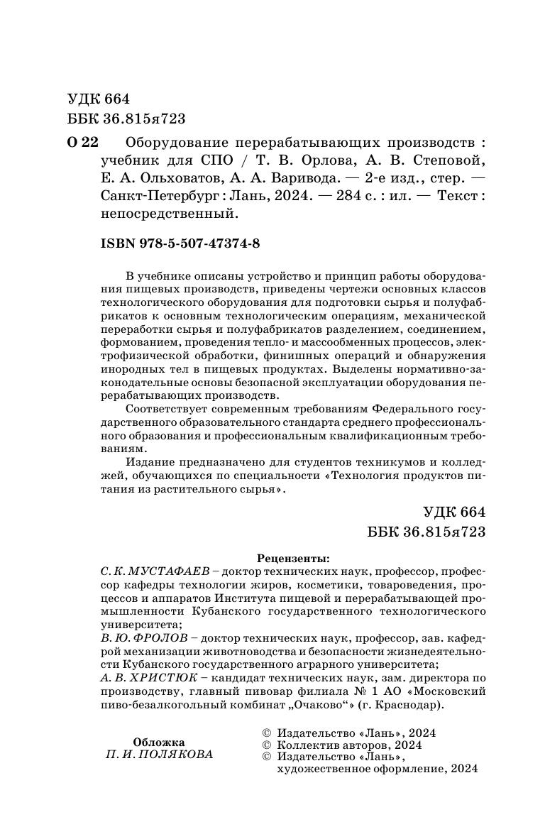 В учебнике описаны устройство и принцип работы оборудования пищевых производств, приведены чертежи основных классов технологического оборудования для подготовки сырья и полуфабрикатов к основным технологическим операциям, механической переработки сырья и полуфабрикатов разделением, соединением, формованием, проведения тепло- и массообменных процессов, электрофизической обработки, финишных операций и обнаружения инородных тел в пищевых продуктах. Выделены нормативно-законодательные основы безопасной эксплуатации оборудования перерабатывающих производств. Соответствует современным требованиям Федерального государственного образовательного стандарта среднего профессионального образования и профессиональным квалификационным требованиям. Издание предназначено для студентов техникумов и колледжей, обучающихся по специальности «Технология продуктов питания из растительного сырья».