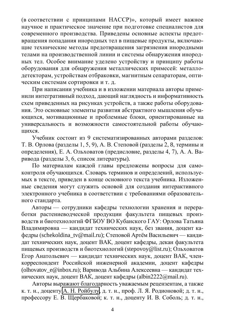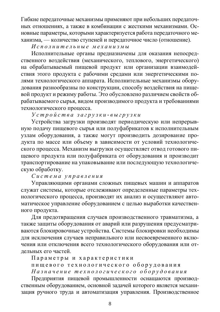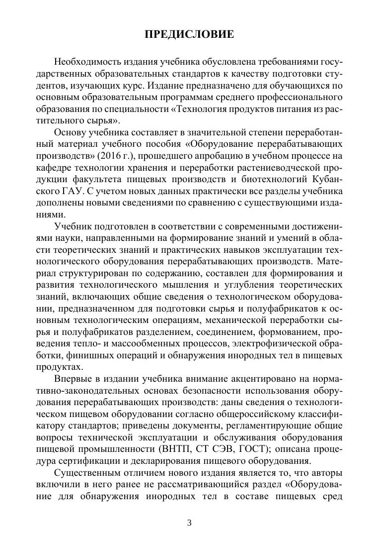 В учебнике описаны устройство и принцип работы оборудования пищевых производств, приведены чертежи основных классов технологического оборудования для подготовки сырья и полуфабрикатов к основным технологическим операциям, механической переработки сырья и полуфабрикатов разделением, соединением, формованием, проведения тепло- и массообменных процессов, электрофизической обработки, финишных операций и обнаружения инородных тел в пищевых продуктах. Выделены нормативно-законодательные основы безопасной эксплуатации оборудования перерабатывающих производств. Соответствует современным требованиям Федерального государственного образовательного стандарта среднего профессионального образования и профессиональным квалификационным требованиям. Издание предназначено для студентов техникумов и колледжей, обучающихся по специальности «Технология продуктов питания из растительного сырья».