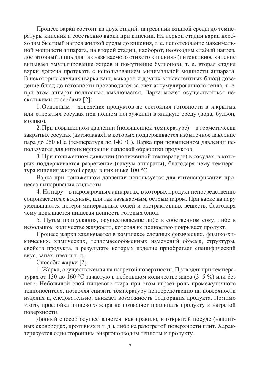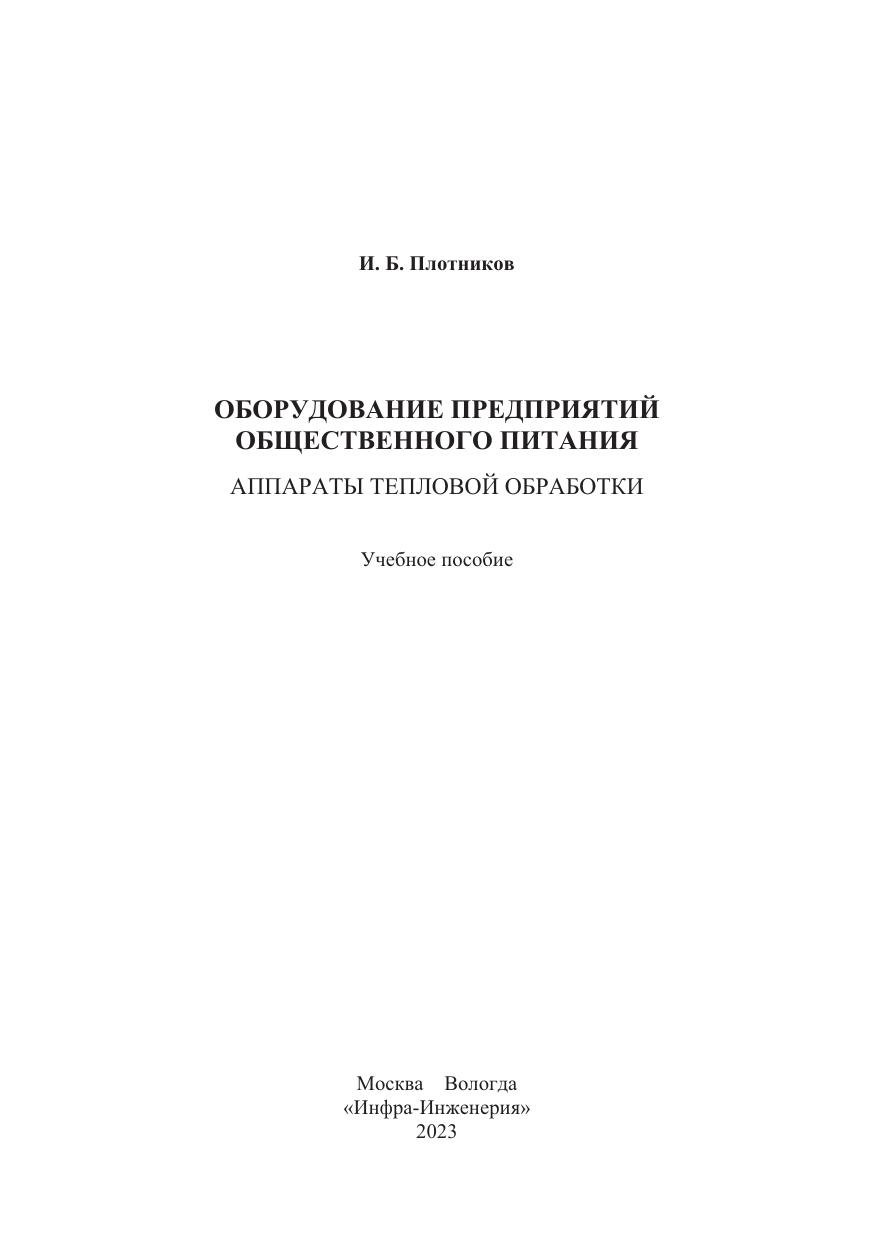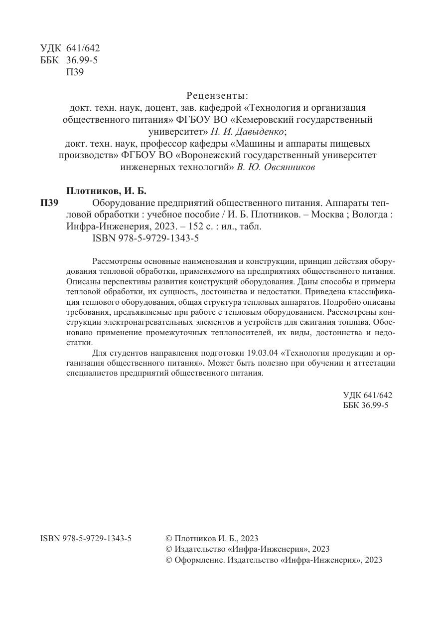 Рассмотрены основные наименования и конструкции, принцип действия оборудования тепловой обработки, применяемого на предприятиях общественного питания. Описаны перспективы развития конструкций оборудования. Даны способы и примеры тепловой обработки, их сущность, достоинства и недостатки. Приведена классификация теплового оборудования, общая структура тепловых аппаратов. Подробно описаны требования, предъявляемые при работе с тепловым оборудованием. Рассмотрены конструкции электронагревательных элементов и устройств для сжигания топлива. Обосновано применение промежуточных теплоносителей, их виды, достоинства и недостатки.