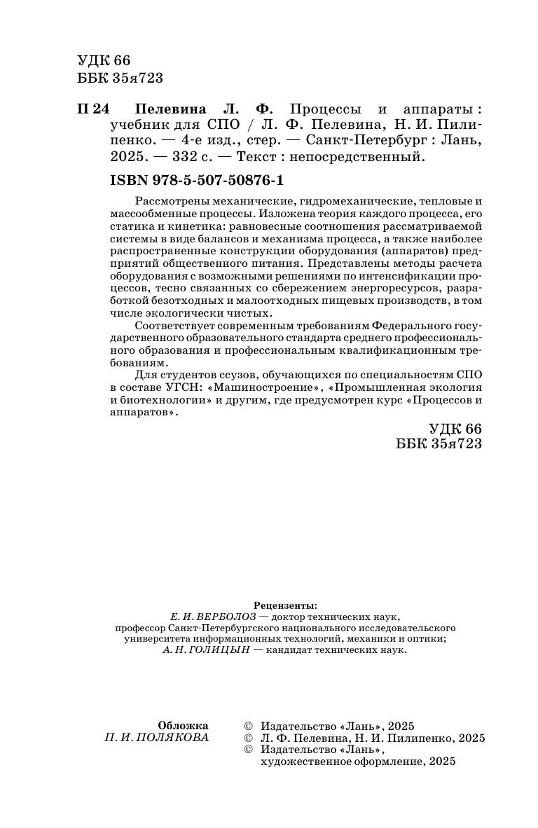 Рассмотрены механические, гидромеханические, тепловые и массообменные процессы. Изложена теория каждого процесса, его статика и кинетика: равновесные соотношения рассматриваемой системы в виде балансов и механизма процесса, а также наиболее распространенные конструкции оборудования (аппаратов) предприятий общественного питания. Представлены методы расчета оборудования с возможными решениями по интенсификации процессов, тесно связанных со сбережением энергоресурсов, разработкой безотходных и малоотходных пищевых производств, в том числе экологически чистых. Соответствует современным требованиям Федерального государственного образовательного стандарта среднего профессионального образования и профессиональным квалификационным требованиям. Для студентов ссузов, обучающихся по специальностям СПО в составе УГСН: «Машиностроение», «Промышленная экология и биотехнологии» и другим, где предусмотрен курс «Процессов и аппаратов».