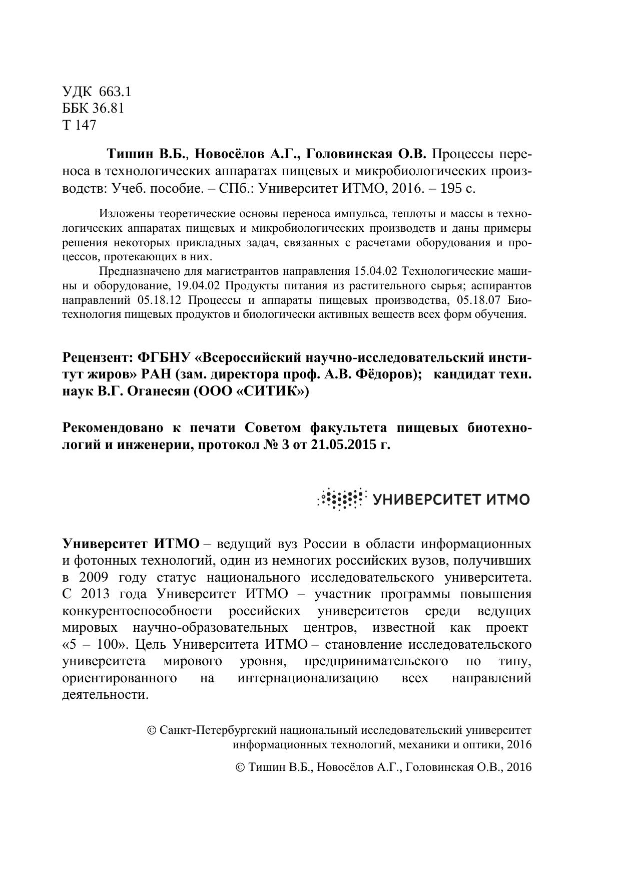 Изложены теоретические основы переноса импульса, теплоты и массы в технологических аппаратах пищевых и микробиологических производств и даны примеры решения некоторых прикладных задач, связанных с расчетами оборудования и процессов, протекающих в них.