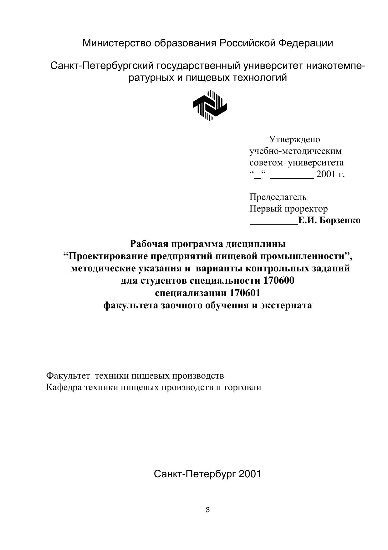 Рабочая программа дисциплины "Проектирование предприятий пищевой промышленности", методические указания и варианты контрольных заданий для студентов спец. 170600 специализ. 170601 факультета заочного обучения и экстерната