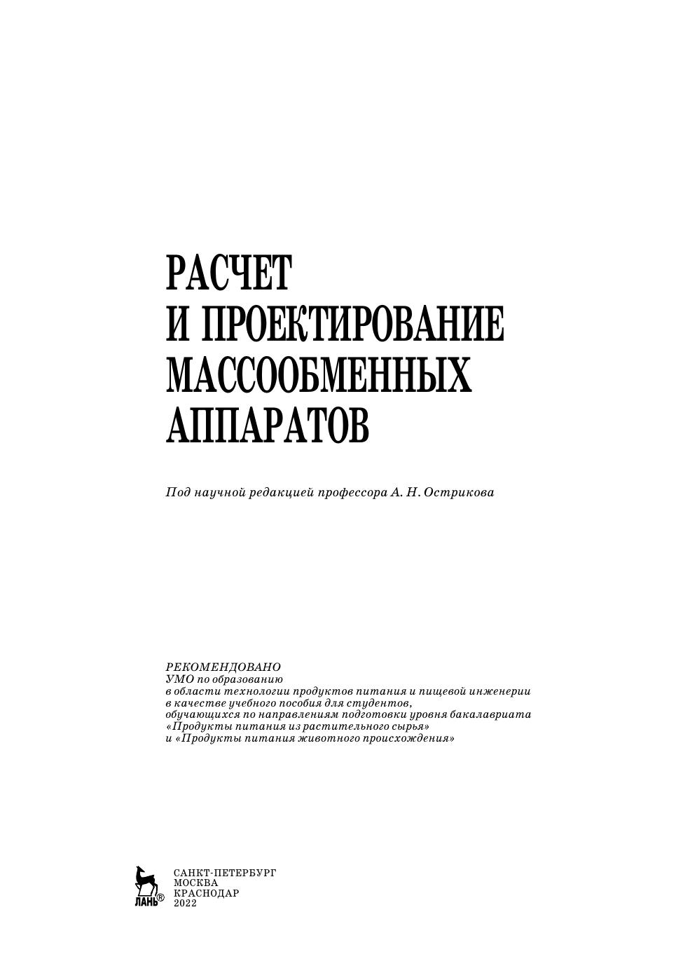 Учебное пособие разработано в соответствие с требованиями ФГОС ВПО подготовки выпускников по направлениям подготовки бакалавров «Продукты питания из растительного сырья» и «Продукты питания животного происхождения». Предназначено для закрепления теоретических знаний дисциплин цикла Б2. Способствует получению студентами практических навыков расчета и проектирования массообменных аппаратов. Приведены основные расчетные зависимости и последовательность выполнения технологического, конструктивного и гидравлического расчетов массообменных аппаратов, правила и примеры выполнения курсовых проектов.