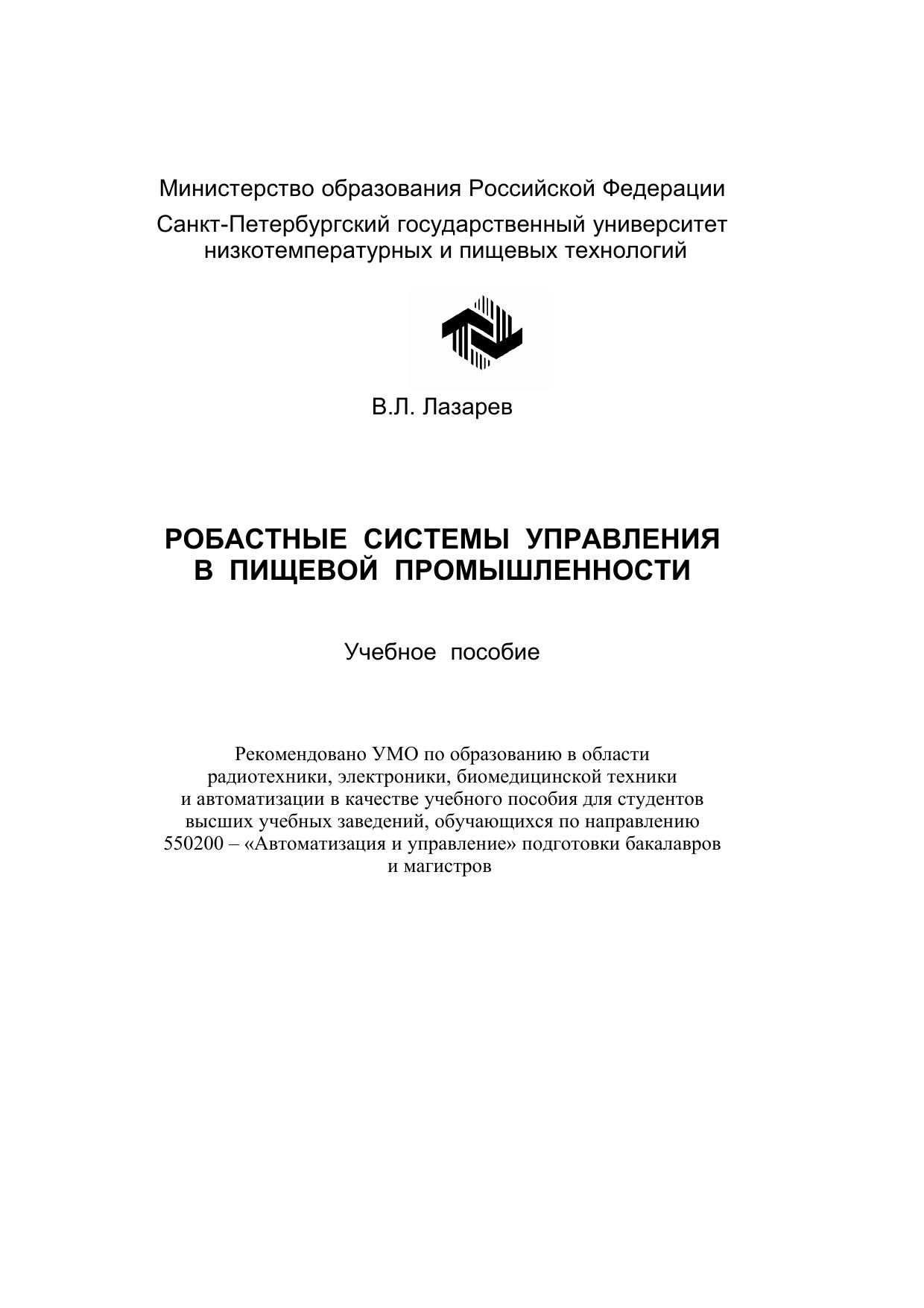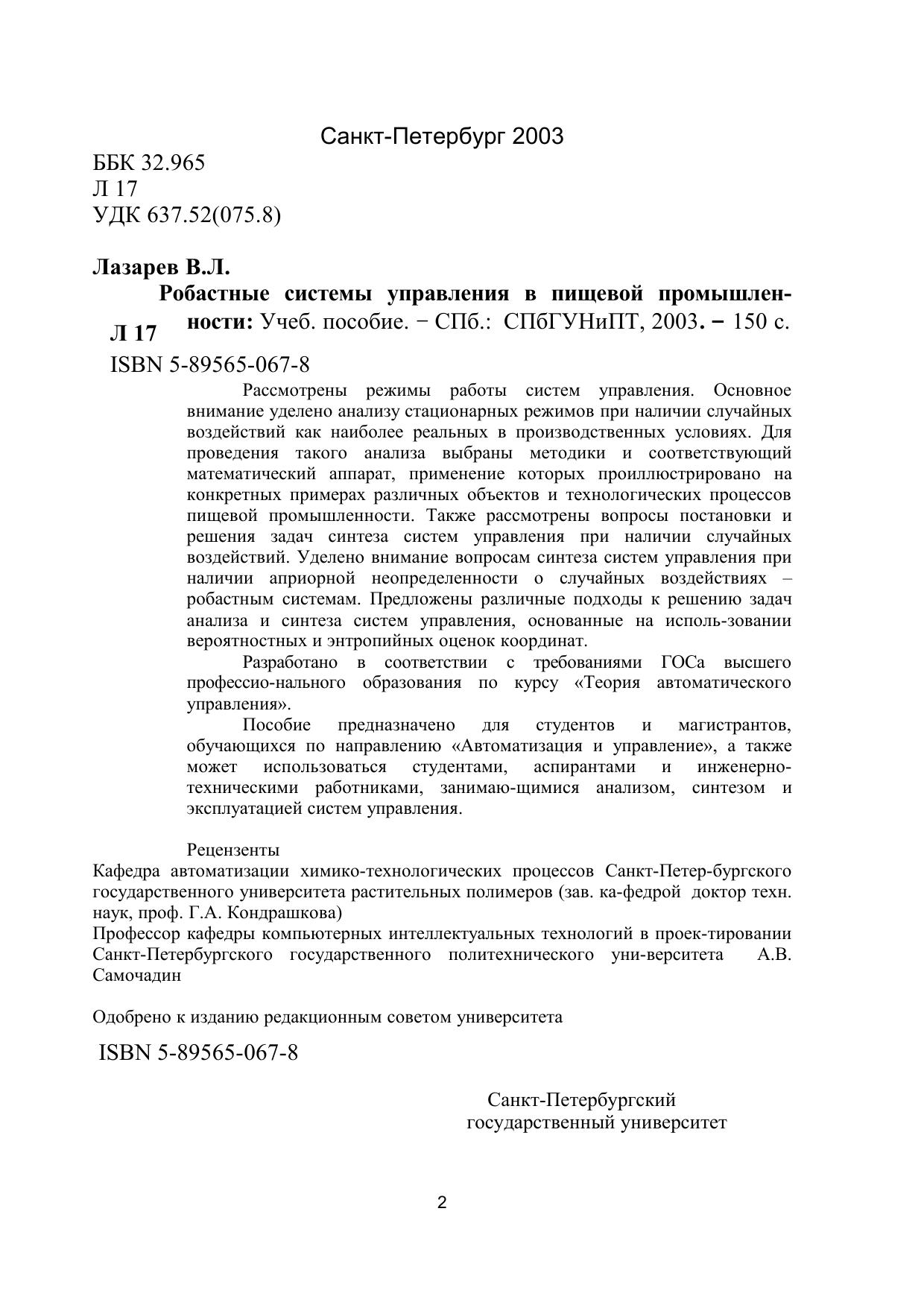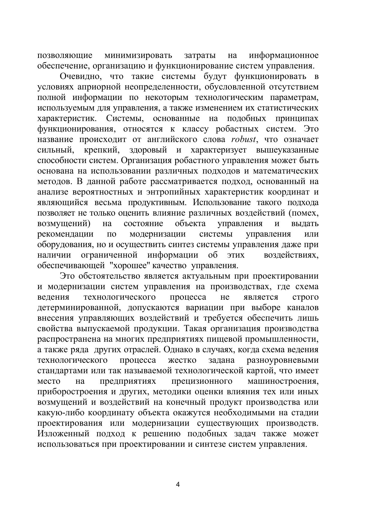 Рассмотрены режимы работы систем управления. Основное внимание уделено анализу стационарных режимов при наличии случайных воздействий как наиболее реальных в производственных условиях. Для проведения такого анализа выбраны методики и соответствующий математический аппарат, применение которых проиллюстрировано на конкретных примерах различных объектов и технологических процессов пищевой промышленности. Также рассмотрены вопросы постановки ирешения задач синтеза систем управления при наличии случайных воздействий. Уделено внимание вопросам синтеза систем управления при наличии априорной неопределенности о случайных воздействиях –робастным системам. Предложены различные подходы к решению задач анализа и синтеза систем управления, основанные на использовании вероятностных и энтропийных оценок координат. Разработано в соответствии с требованиями ГОСа высшего профессионального образования по курсу «Теория автоматического управления». Пособие предназначено для студентов и магистрантов, обучающихся по направлению «Автоматизация и управление», а также может использоваться студентами, аспирантами и инженерно- техническими работниками, занимаю-щимися анализом, синтезом и эксплуатацией систем управления.
