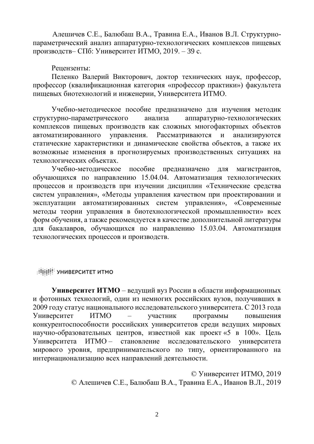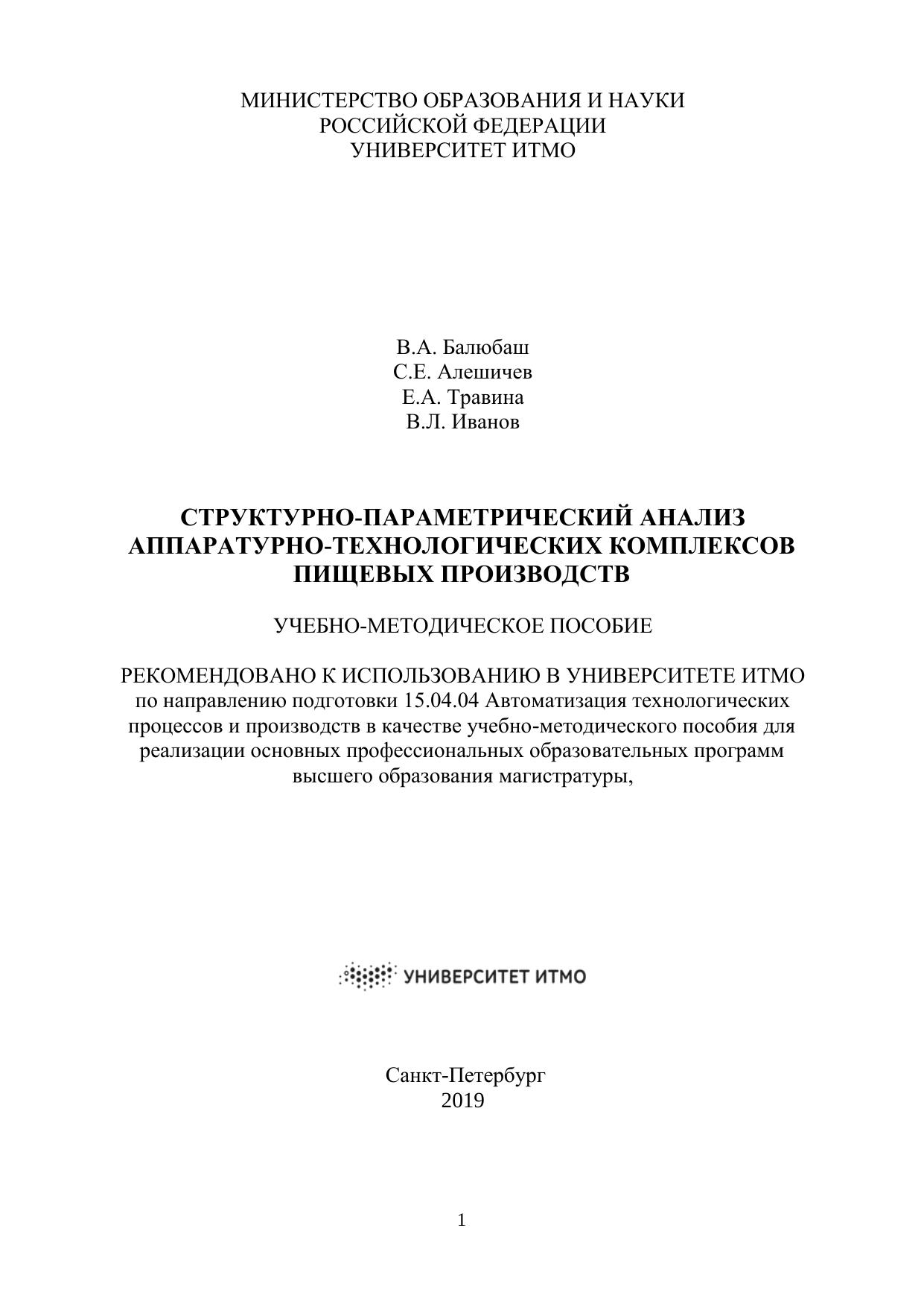 Учебно-методическое пособие предназначено для изучения методик структурно-параметрического анализа аппаратурно-технологических комплексов пищевых производств как сложных многофакторных объектов автоматизированного управления. Рассматриваются и анализируются статические характеристики и динамические свойства объектов, а также их возможные изменения в прогнозируемых производственных ситуациях на технологических объектах. Учебно-методическое пособие предназначено для магистрантов, обучающихся по направлению 15.04.04. Автоматизация технологических процессов и производств при изучении дисциплин «Технические средства систем управления», «Методы управления качеством при проектировании и эксплуатации автоматизированных систем управления», «Современные методы теории управления в биотехнологической промышленности» всех форм обучения, а также рекомендуется в качестве дополнительной литературы для бакалавров, обучающихся по направлению 15.03.04. Автоматизация технологических процессов и производств