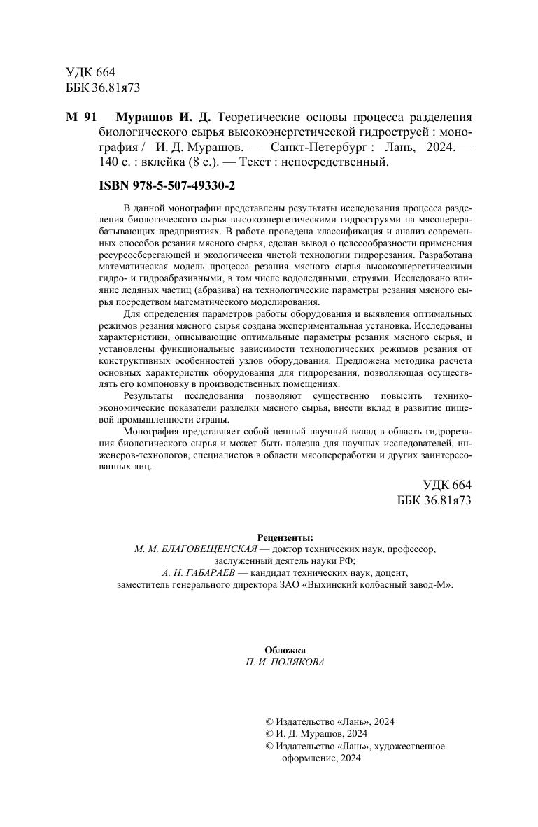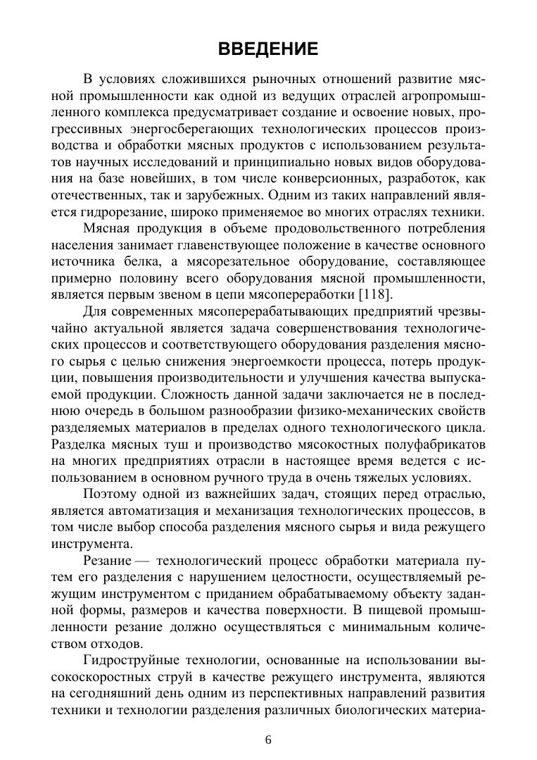 В данной монографии представлены результаты исследования процесса разделения биологического сырья высокоэнергетическими гидроструями на мясоперерабатывающих предприятиях. В работе проведена классификация и анализ современных способов резания мясного сырья, сделан вывод о целесообразности применения ресурсосберегающей и экологически чистой технологии гидрорезания. Разработана математическая модель процесса резания мясного сырья высокоэнергетическими гидро- и гидроабразивными, в том числе водоледяными, струями. Исследовано влияние ледяных частиц (абразива) на технологические параметры резания мясного сырья посредством математического моделирования. Для определения параметров работы оборудования и выявления оптимальных режимов резания мясного сырья создана экспериментальная установка. Исследованы характеристики, описывающие оптимальные параметры резания мясного сырья, и установлены функциональные зависимости технологических режимов резания от конструктивных особенностей узлов оборудования. Предложена методика расчета основных характеристик оборудования для гидрорезания, позволяющая осуществлять его компоновку в производственных помещениях. Результаты исследования позволяют существенно повысить технико-экономические показатели разделки мясного сырья, внести вклад в развитие пищевой промышленности страны. Монография представляет собой ценный научный вклад в область гидрореза-ния биологического сырья и может быть полезна для научных исследователей, инже-неров-технологов, специалистов в области мясопереработки и других заинтересованных лиц.
