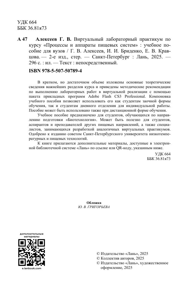 В кратком, но достаточном объеме изложены основные теоретические сведения важнейших разделов курса и приведены методические рекомендации по выполнению лабораторных работ в виртуальной реализации с помощью пакета прикладных программ Adobe Flash CS3 Professional. Компоновка учебного пособия позволяет использовать его как студентам заочной формы обучения, так и студентам дневного отделения для индивидуальной работы. Пособие может быть использовано также при дистанционной форме обучения. Учебное пособие предназначено для студентов, обучающихся по направлению подготовки «Биотехнология». Может быть полезно для студентов, аспирантов и преподавателей других пищевых направлений, а также специалистов, занимающихся разработкой аналогичных виртуальных практикумов. Одобрено к изданию советом Санкт-Петербургского университета низкотемпературных и пищевых технологий. К книге прилагаются дополнительные материалы, доступные в электронной библиотечной системе «Лань» по ссылке или QR-коду, указанным ниже.