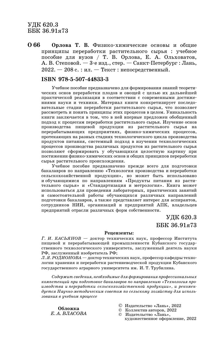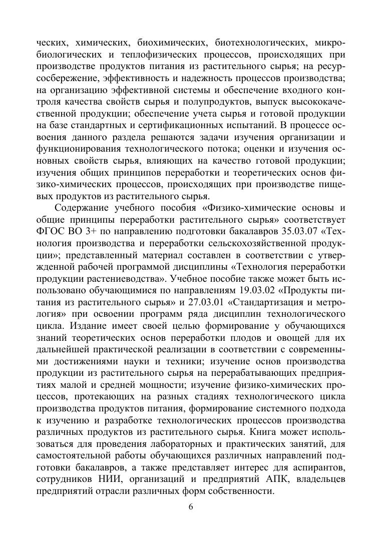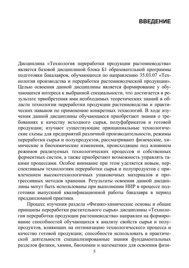 Учебное пособие предназначено для формирования знаний теоретических основ переработки плодов и овощей с целью их дальнейшей практической реализации в соответствии с современными достижениями науки и техники. Материал книги конкретизирует последовательные стадии переработки растительного сырья, что позволяет рассмотреть и понять принципы этих процессов в целом. Уникальность книги заключается в том, что в ней впервые предложен обобщенный подход к процессам переработки растительного сырья. Изучение основ производства пищевой продукции из растительного сырья на перерабатывающих предприятиях, физико-химических процессов, протекающих на разных стадиях технологического цикла производства продуктов питания, системный подход в изучении технологических процессов производства различных продуктов из растительного сырья позволяют сформировать у обучающихся целостную картину при постижении физико-химических основ и общих принципов переработки сырья растительного происхождения. Учебное пособие предназначено, прежде всего, для подготовки бакалавров по направлению «Технология производства и переработки сельскохозяйственной продукции», но может быть использовано и обучающимися по направлениям «Продукты питания из растительного сырья» и «Стандартизация и метрология». Книга может использоваться для проведения лабораторных, практических занятий и самостоятельной работы обучающихся различных направлений подготовки бакалавров, а также представляет интерес для аспирантов, сотрудников НИИ, организаций и предприятий АПК, владельцев предприятий отрасли различных форм собственности.