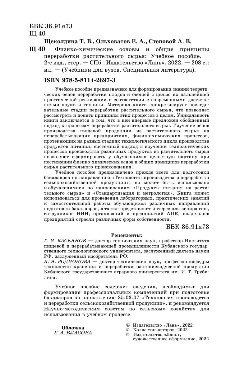 Учебное пособие предназначено для формирования знаний теоретических основ переработки плодов и овощей с целью их дальнейшей практической реализации в соответствии с современными достижениями науки и техники. Материал книги конкретизирует последовательные стадии переработки растительного сырья, что позволяет рассмотреть и понять принципы этих процессов в целом. Уникальность книги заключается в том, что в ней впервые предложен обобщенный подход к процессам переработки растительного сырья. Изучение основ производства пищевой продукции из растительного сырья на перерабатывающих предприятиях, физико-химических процессов, протекающих на разных стадиях технологического цикла производства продуктов питания, системный подход в изучении технологических процессов производства различных продуктов из растительного сырья позволяют сформировать у обучающихся целостную картину при постижении физико-химических основ и общих принципов переработки сырья растительного происхождения. Учебное пособие предназначено, прежде всего, для подготовки бакалавров по направлению «Технология производства и переработки сельскохозяйственной продукции», но может быть использовано и обучающимися по направлениям «Продукты питания из растительного сырья» и «Стандартизация и метрология». Книга может использоваться для проведения лабораторных, практических занятий и самостоятельной работы обучающихся различных направлений подготовки бакалавров, а также представляет интерес для аспирантов, сотрудников НИИ, организаций и предприятий АПК, владельцев предприятий отрасли различных форм собственности.