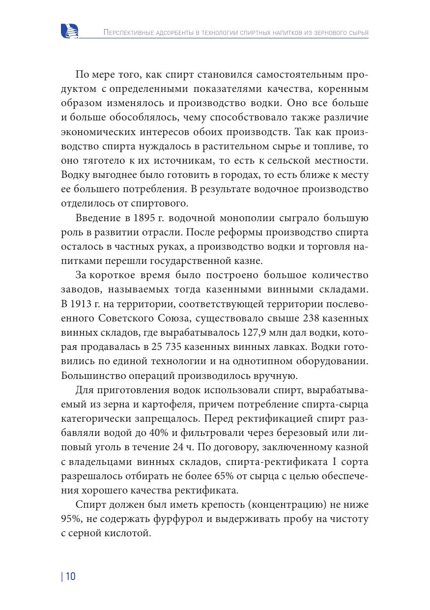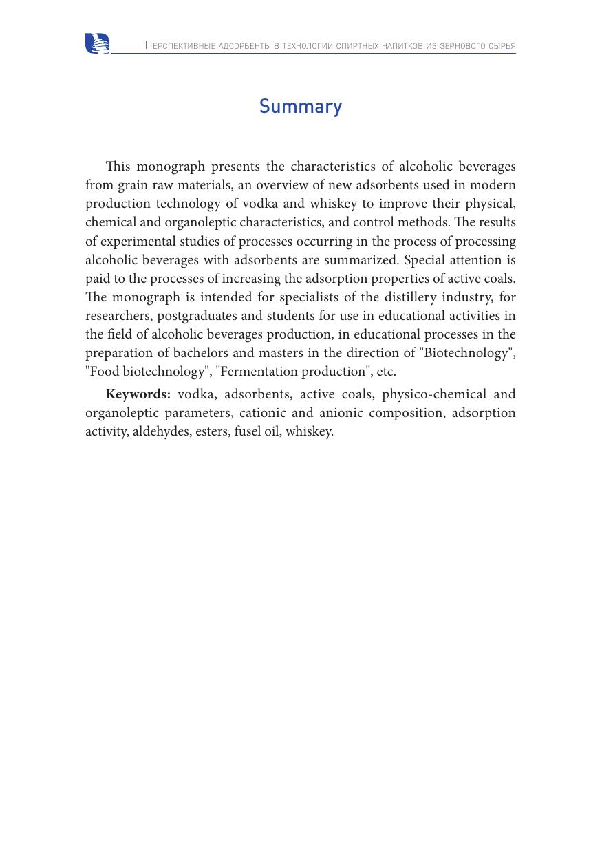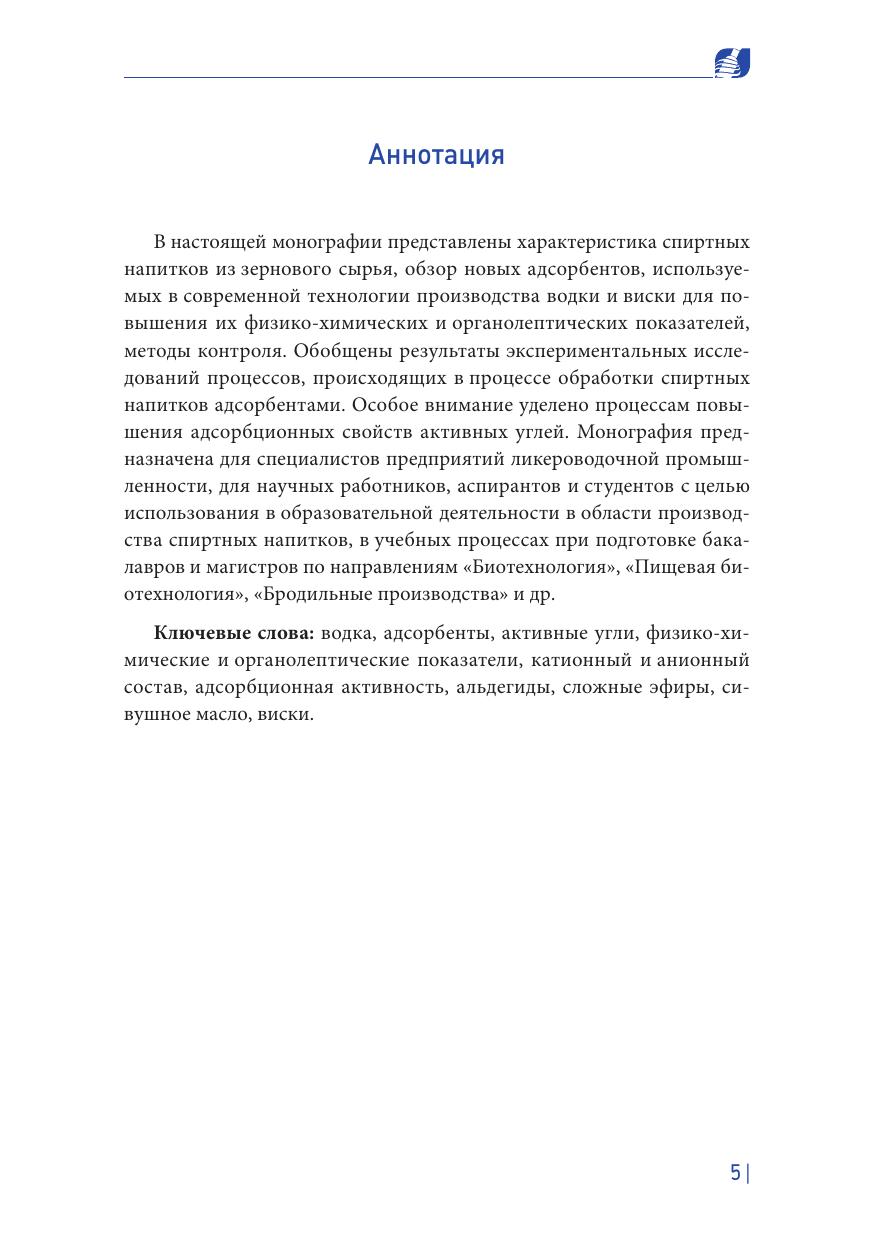 В настоящей монографии представлены характеристика спиртных напитков из зернового сырья, обзор новых адсорбентов, используемых в современной технологии производства водки и виски для повышения их физико-химических и органолептических показателей, методы контроля. Обобщены данные экспериментальных исследований процессов, происходящих в результате обработки спиртных напитков адсорбентами.