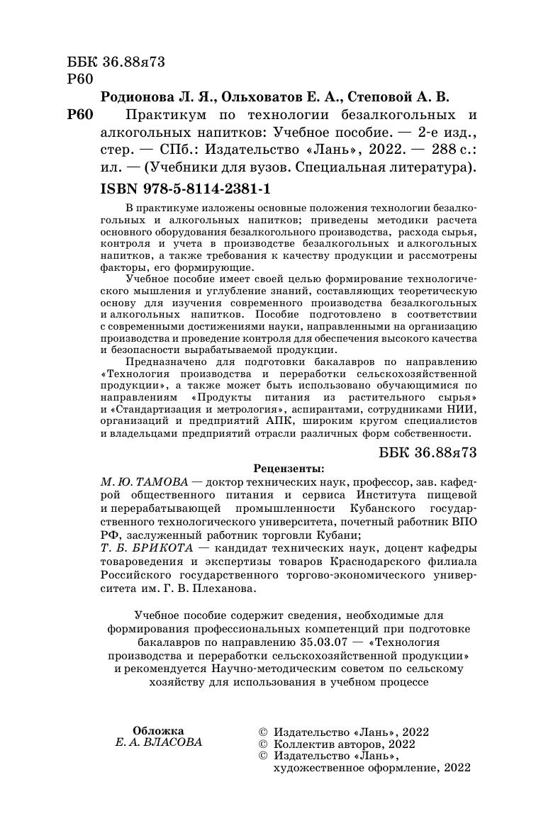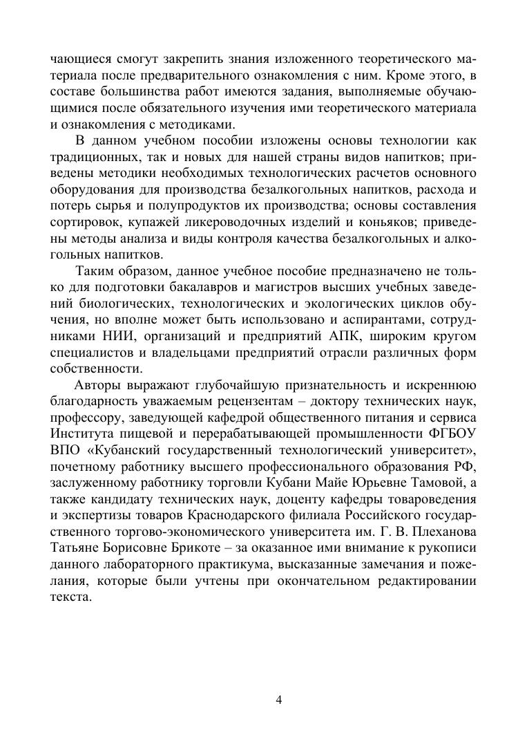 В практикуме изложены основные положения технологии безалкогольных и алкогольных напитков, приведены методики расчета основного оборудования безалкогольного производства, расхода сырья, контроля и учета в производстве безалкогольных и алкогольных напитков, а также требования к качеству продукции и рассмотрены факторы, его формирующие. Учебное пособие имеет своей целью формирование технологического мышления и углубление знаний, составляющих теоретическую основу для изучения современного производства безалкогольных и алкогольных напитков. Пособие подготовлено в соответствии с современными достижениями науки, направленными на организацию производства и проведение контроля для обеспечения высокого качества и безопасности вырабатываемой продукции. Предназначено для подготовки бакалавров по направлению «Технология производства и переработки сельскохозяйственной продукции», а также может быть использовано обучающимися по направлениям «Продукты питания из растительного сырья» и «Стандартизация и метрология», аспирантами, сотрудниками НИИ, организаций и предприятий АПК, широким кругом специалистов и владельцами предприятий отрасли различных форм собственности.