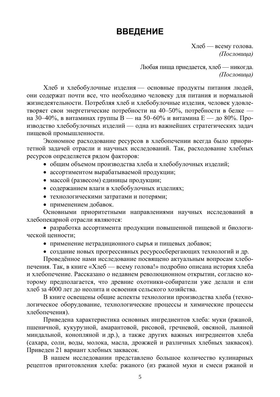 Настоящее учебное пособие предназначено для обучения студентов в рамках СПО. Так, например, при обучении по специальности «Технология продуктов питания из растительного сырья» в рамках профессионального модуля «Ведение технологического процесса производства хлеба, хлебобулочных, макаронных и кондитерских изделий на автоматизированных технологических линиях», при изучении темы «Технология хлеба и хлебобулочных изделий», студент должен овладеть компетенцией по выполнению технологических операций по производству хлеба, хлебобулочных, макаронных и кондитерских изделий в соответствии с технологическими инструкциями. Обеспечение формирования компетенций такого рода достигается тем, что в учебном пособии дано исчерпывающее описание истории хлеба с необходимыми аспектами технологии его производства. В нем даны характеристики основных ингредиентов хлеба. Дополнительно в учебном пособии представлено большое количество кулинарных рецептов приготовления хлеба из разных видов растительного сырья. Кроме этого, приведены рецепты национальных видов хлеба более 50 стран мира (бейгл, бисквит, брецель и др.). Приведены рецепты приготовления хлебной посуды. Подробно описано использование хлеба в диетологии и народной медицине. Соответствует современным требованиям Федерального государственного образовательного стандарта среднего профессионального образования и профессиональным квалификационным требованиям. Учебное пособие может представлять интерес не только для студентов, обучающихся по пищевым направлениям, но и для технологов хлебопекарного производства, работников сферы общественного питания, шеф-поваров, а также широкого круга читателей, интересущихся приготовлением вкусного и полезного хлеба с минимальными затратами сил и времени.