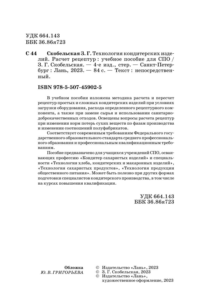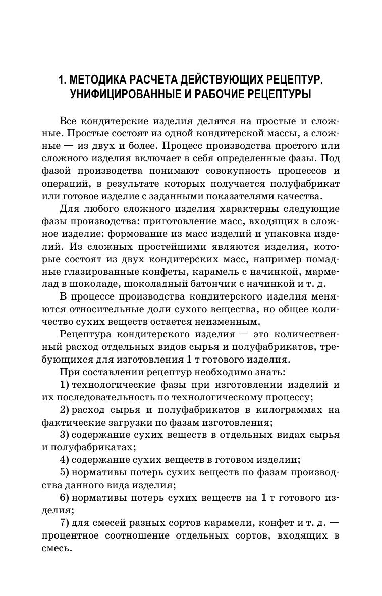 В учебном пособии изложена методика расчета и пересчет рецептур простых и сложных кондитерских изделий при условиях загрузки оборудования, расхода определенного рецептурного компонента, а также при замене сырья и использовании санитарнодоброкачественных отходов. Освещены вопросы расчета рецептур при изменении норм потерь сухих веществ по фазам производства и изменении соотношений полуфабрикатов. Соответствует современным требованиям Федерального государственного образовательного стандарта среднего профессионального образования и профессиональным квалификационным требованиям. Пособие предназначено для учащихся учреждений СПО, осваивающих профессию «Кондитер сахаристых изделий» и специальности «Технология хлеба, кондитерских и макаронных изделий», «Технология сахаристых продуктов», «Технология продукции общественного питания». Может быть полезно при других формах подготовки специалистов кондитерского производства, в том числе на курсах повышения квалификации.