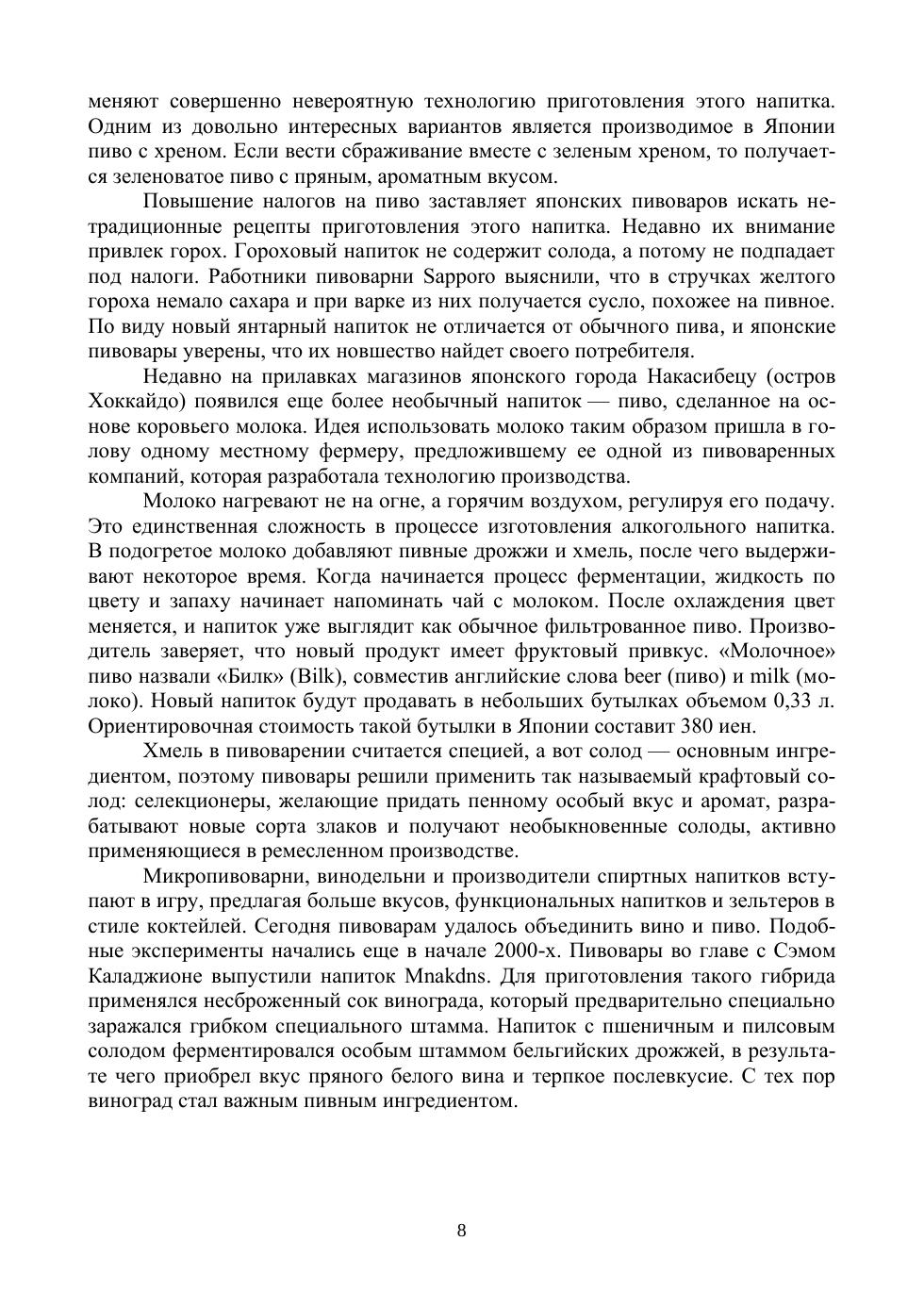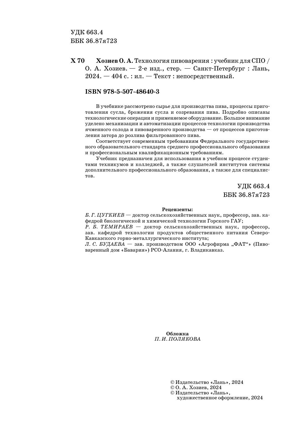 В учебнике рассмотрено сырье для производства пива, процессы приготовления сусла, брожения сусла и созревания пива. Подробно описаны технологические операции и применяемое оборудование. Большое внимание уделено механизации и автоматизации процессов технологии производства ячменного солода и пивоваренного производства — от процессов приготовления затора до розлива фильтрованного пива. Соответствует современным требованиям Федерального государственного образовательного стандарта среднего профессионального образования и профессиональным квалификационным требованиям. Учебник предназначен для использования в учебном процессе студентами техникумов и колледжей, а также слушателей институтов системы дополнительного профессионального образования, а также для специалистов.