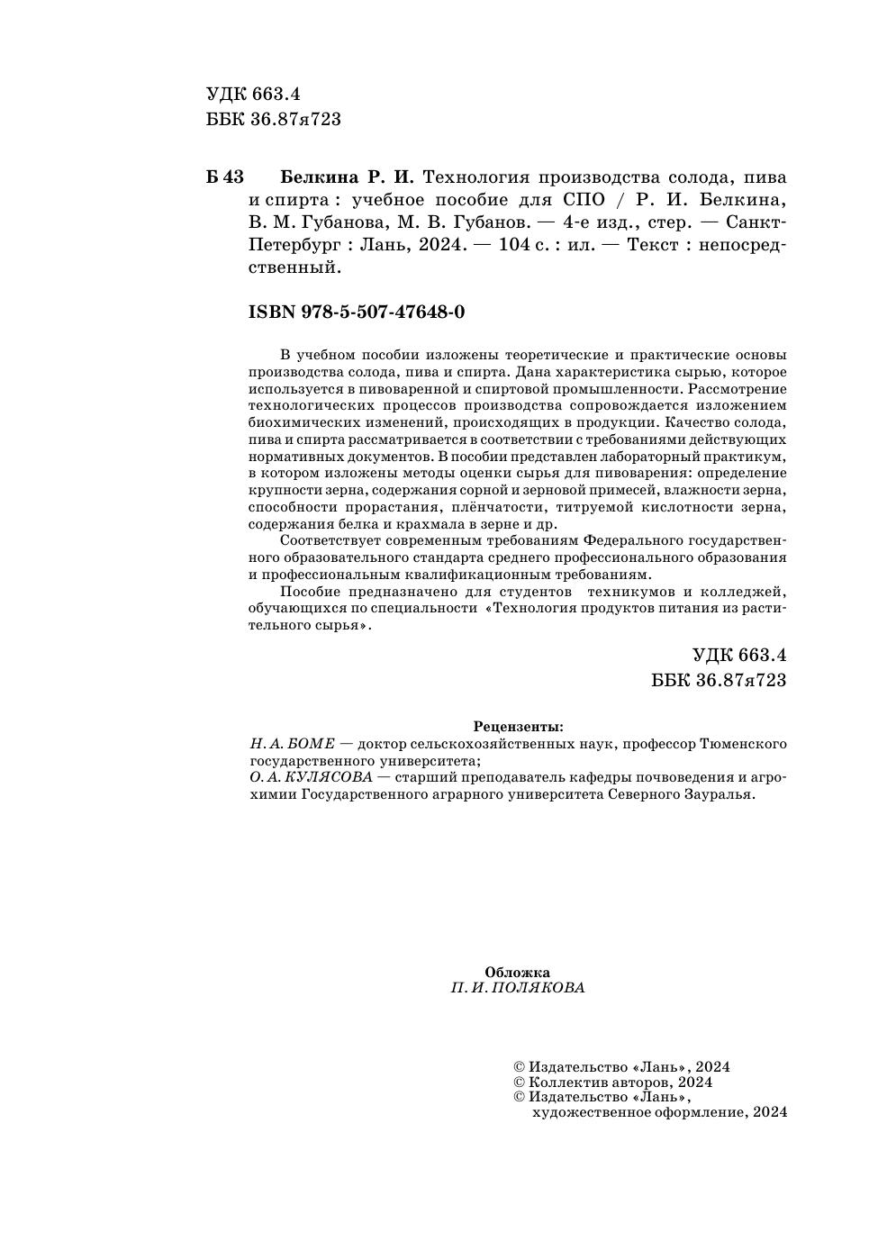 В учебном пособии изложены теоретические и практические основы производства солода, пива и спирта. Дана характеристика сырью, которое используется в пивоваренной и спиртовой промышленности. Рассмотрение технологических процессов производства сопровождается изложением биохимических изменений, происходящих в продукции. Качество солода, пива и спирта рассматривается в соответствии с требованиями действующих нормативных документов. В пособии представлен лабораторный практикум, в котором изложены методы оценки сырья для пивоварения: определение крупности зерна, содержания сорной и зерновой примесей, влажности зерна, способности прорастания, плёнчатости, титруемой кислотности зерна, содержания белка и крахмала в зерне и др. Соответствует современным требованиям Федерального государственного образовательного стандарта среднего профессионального образования и профессиональным квалификационным требованиям. Пособие предназначено для студентов техникумов и колледжей, обучающихся по специальности «Технология продуктов питания из растительного сырья».