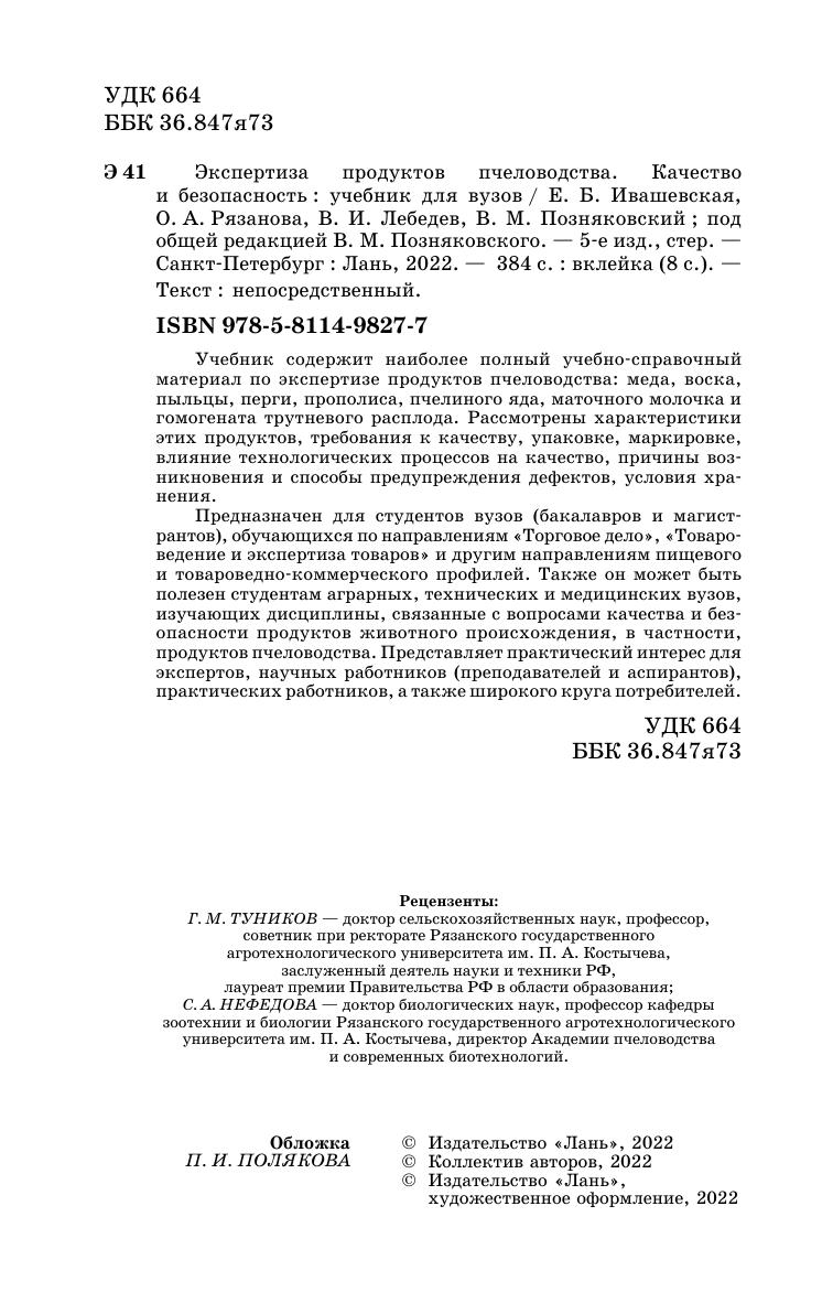 Учебник содержит наиболее полный учебно-справочный материал по экспертизе продуктов пчеловодства: меда, воска, пыльцы, перги, прополиса, пчелиного яда, маточного молочка и гомогената трутневого расплода. Рассмотрены характеристики этих продуктов, требования к качеству, упаковке, маркировке, влияние технологических процессов на качество, причины возникновения и способы предупреждения дефектов, условия хранения.