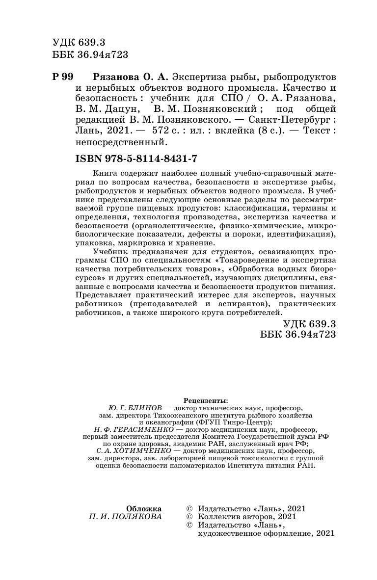 Книга содержит наиболее полный учебно-справочный материал по вопросам качества, безопасности и экспертизе рыбы, рыбопродуктов и нерыбных объектов водного промысла. В учебнике представлены следующие основные разделы по рассматриваемой группе пищевых продуктов: классификация, термины и определения, технология производства, экспертиза качества и безопасности (органолептические, физико-химические, микробиологические показатели, дефекты и пороки, идентификация), упаковка, маркировка и хранение.
