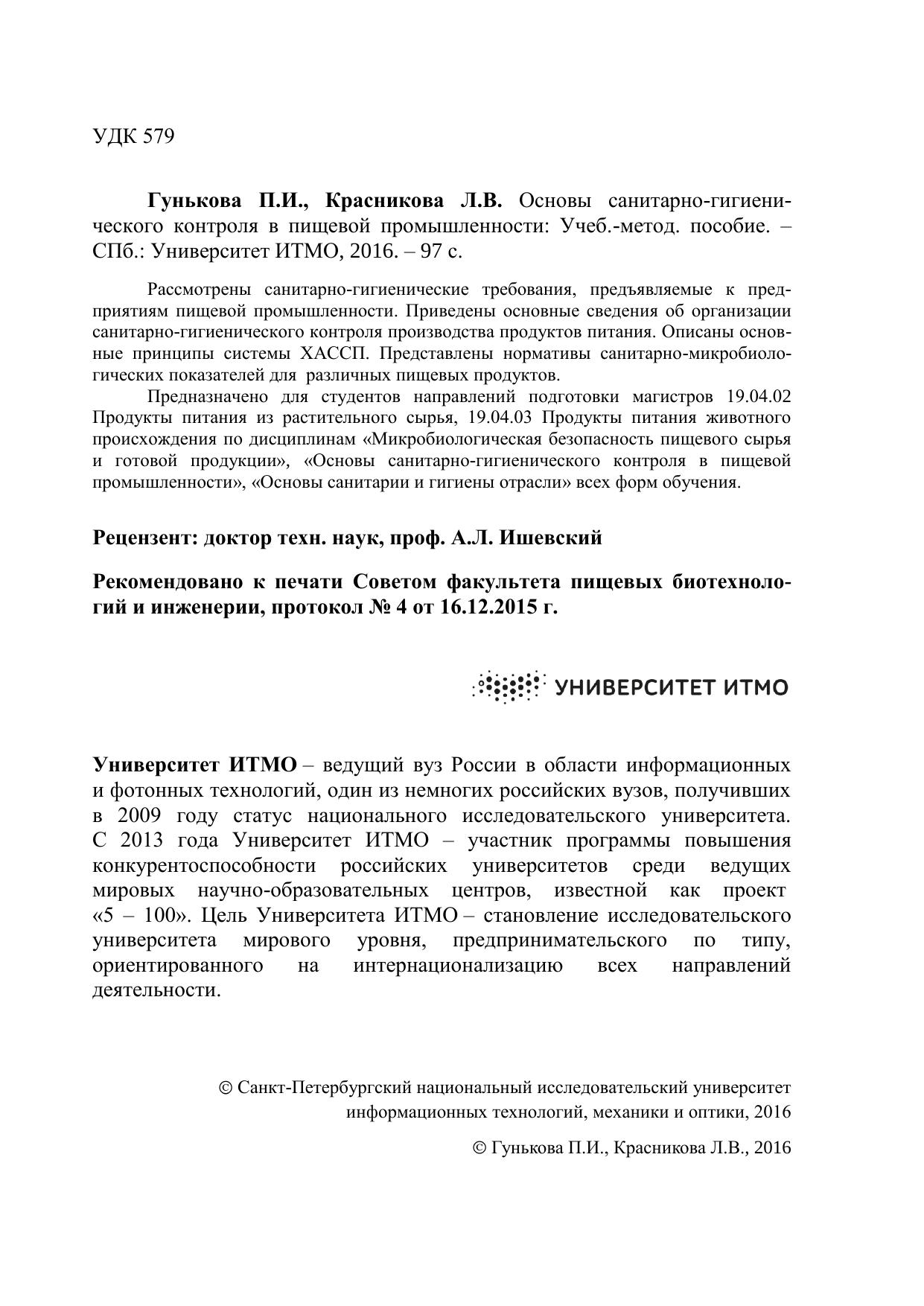 Предназначено для студентов направлений подготовки магистров 19.04.02 Продукты питания из растительного сырья, 19.04.03 Продукты питания животного происхождения по дисциплинам «Микробиологическая безопасность пищевого сырья и готовой продукции», «Основы санитарно-гигиенического контроля в пищевой промышленности», «Основы санитарии и гигиены отрасли» всех форм обучения.