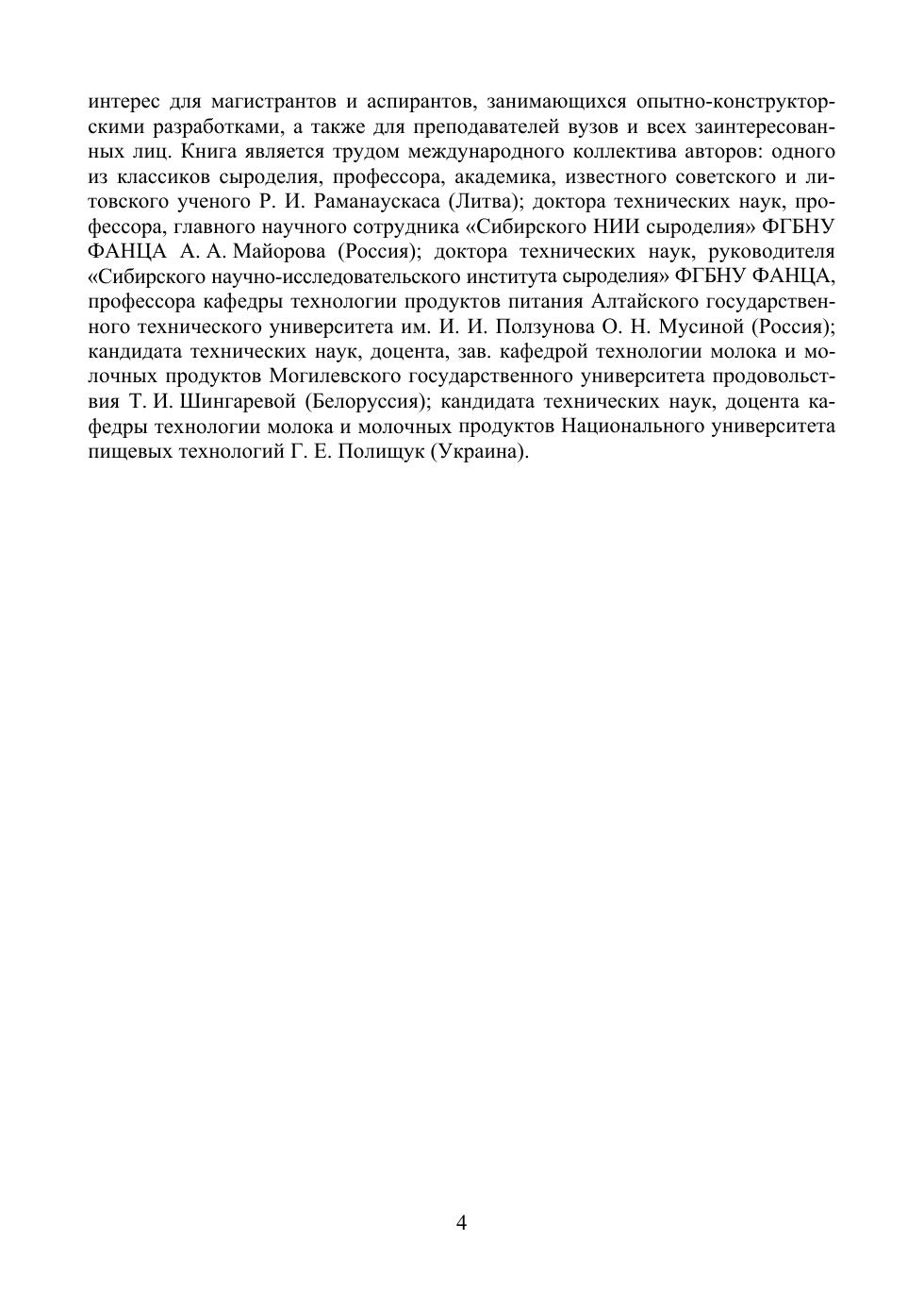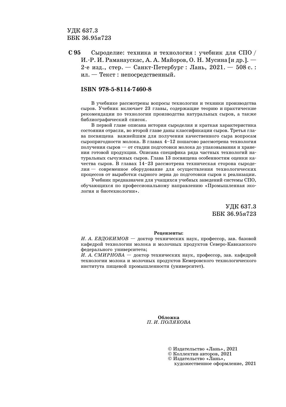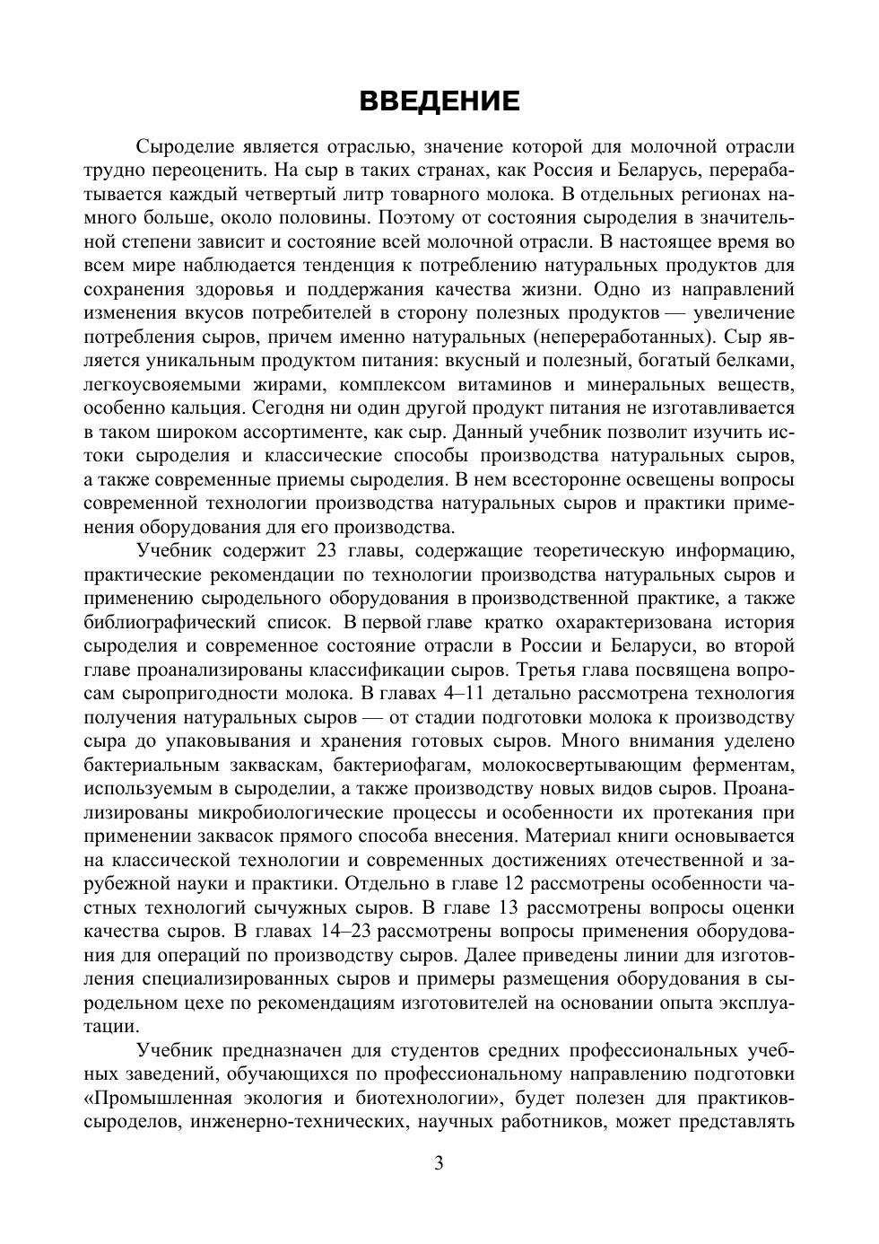В первой главе описана история сыроделия и краткая характеристика состояния отрасли, во второй главе даны классификации сыров. Третья глава посвящена важнейшим для получения качественного сыра вопросам сыропригодности молока. В главах 4–12 пошагово рассмотрена технология получения сыров — от стадии подготовки молока до упаковывания и хранения готовой продукции. Описана специфика ряда частных технологий натуральных сычужных сыров. Глава 13 посвящена особенностям оценки качества сыров. В главах 14–23 рассмотрена техническая сторона сыроделия — современное оборудование для осуществления технологических процессов от выработки сырного зерна до подготовки сыров к реализации. Учебник предназначен для учащихся учебных заведений системы СПО, обучающихся по профессиональному направлению «Промышленная экология и биотехнологии».