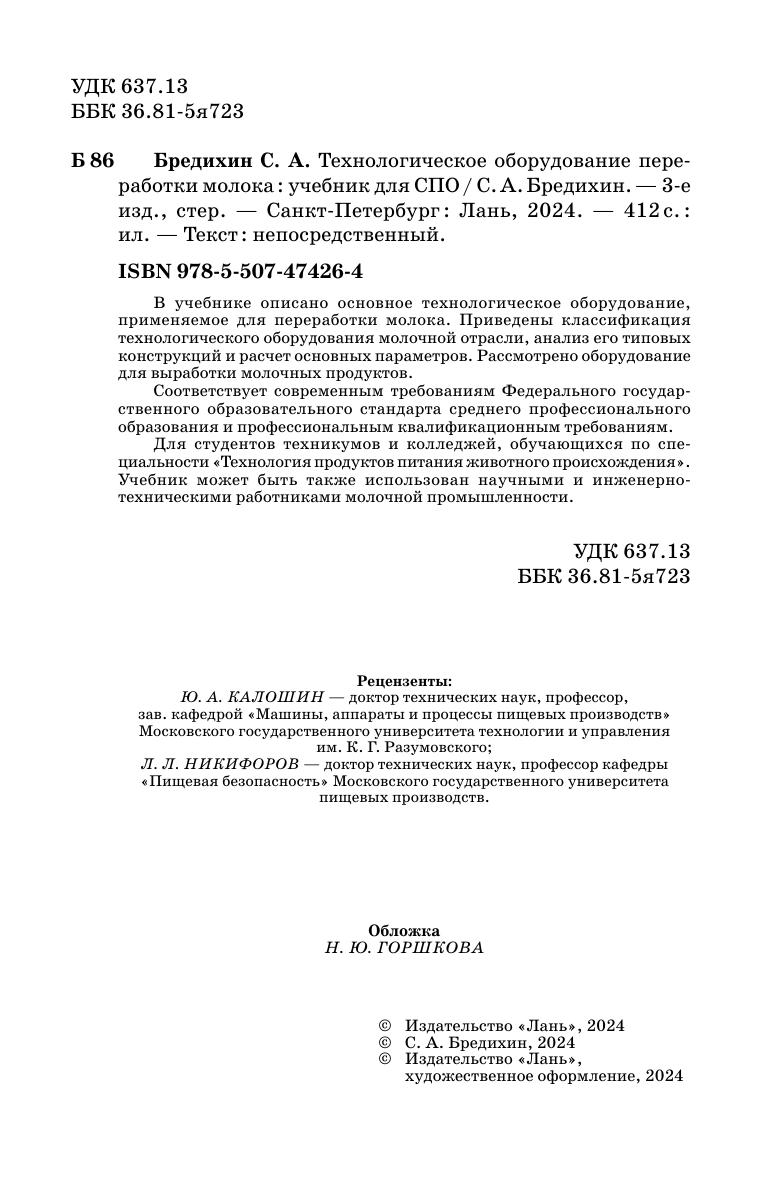 В учебнике описано основное технологическое оборудование, применяемое для переработки молока. Приведены классификация технологического оборудования молочной отрасли, анализ его типовых конструкций и расчет основных параметров. Рассмотрено оборудование для выработки молочных продуктов. Соответствует современным требованиям Федерального государственного образовательного стандарта среднего профессионального образования и профессиональным квалификационным требованиям. Для студентов техникумов и колледжей, обучающихся по специальности «Технология продуктов питания животного происхождения». Учебник может быть также использовано научными и инженерно-техническими работниками молочной промышленности.